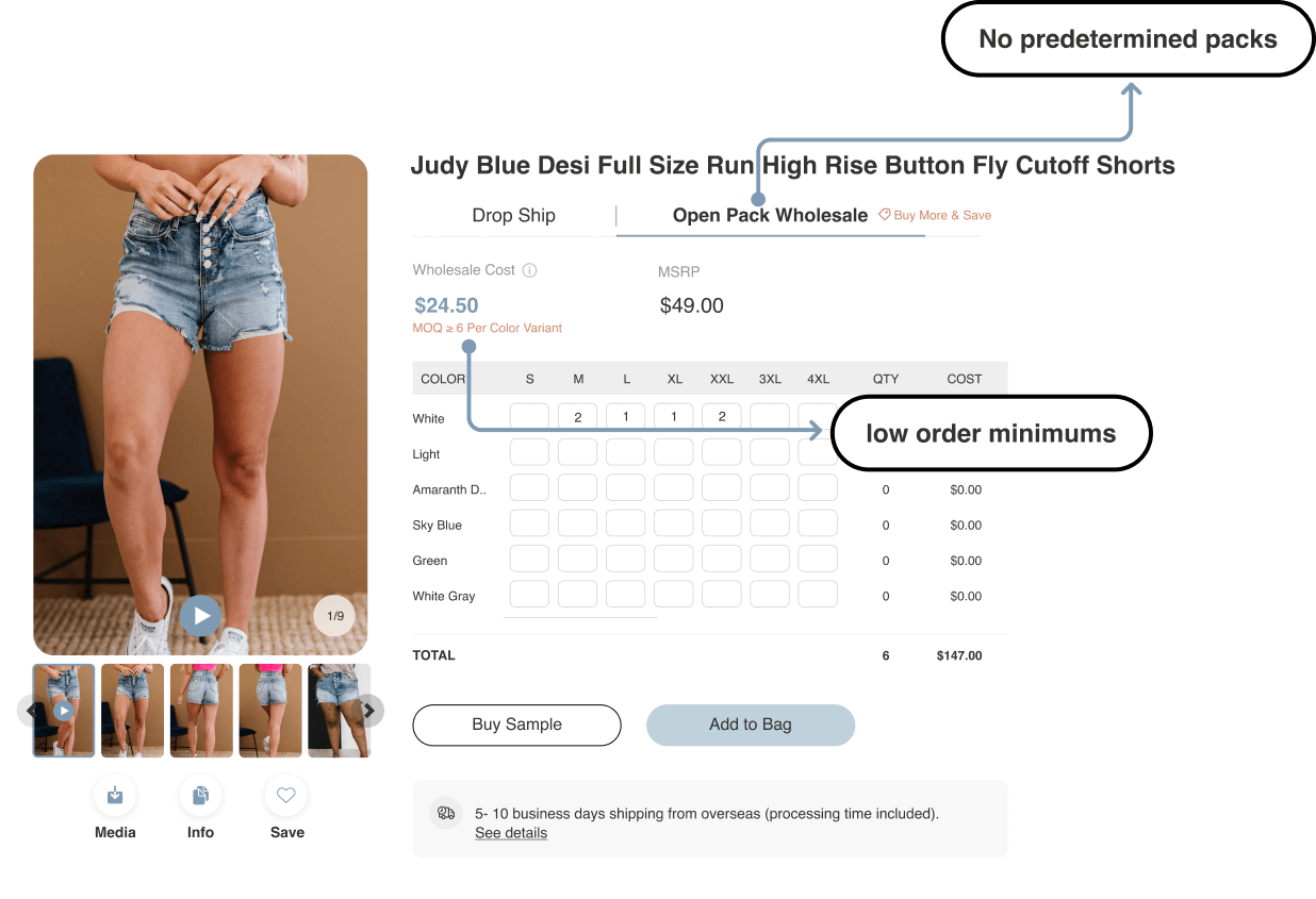 - Open Pack & Low MOQ: Break free from the constraints of predetermined packs. With Trendsi, you have the flexibility to select any quantity of sizes, starting with a low minimum order quantity of just 6 per color variant. Sample before you buy wholesale, aligning perfectly with your business needs.
