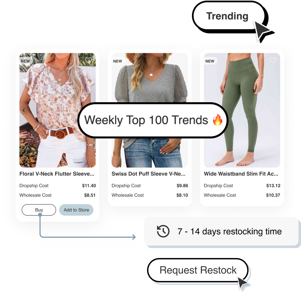 - Rapid Restocking of Bestsellers: Never miss out on a sales opportunity with Trendsi's quick 7-14 business day restocking capabilities. Maintain a lean inventory while maximizing sales and reducing risk.