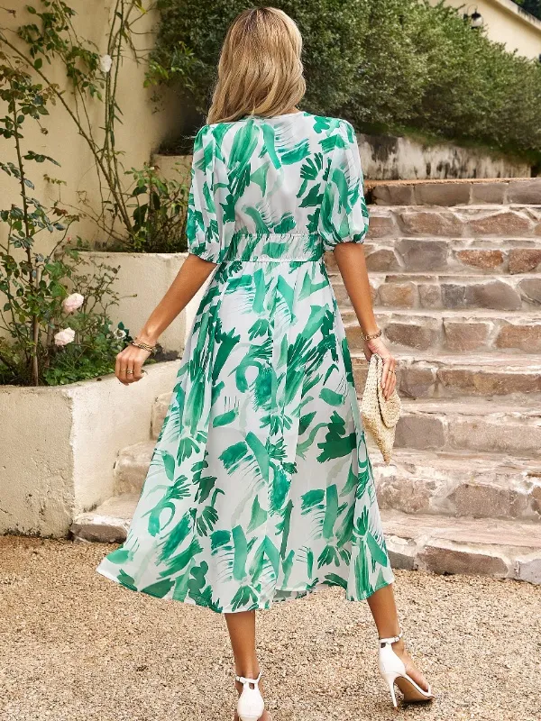 Devine Smocked Printed V-Neck Half Sleeve Midi Dress