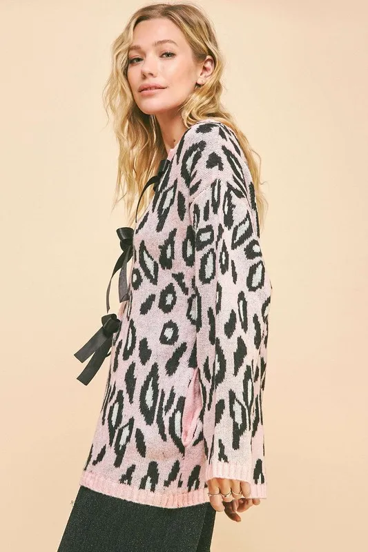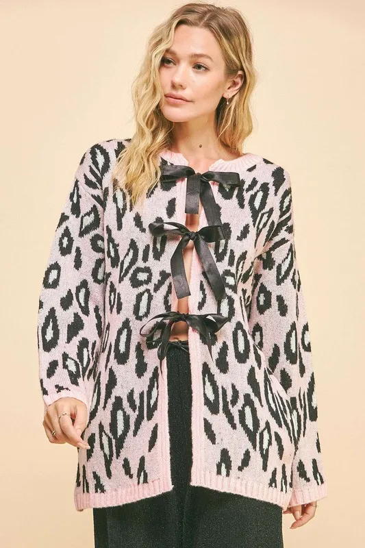 Davi & Dani Leopard Ribbon Tie Front Loose Fit Cardigan