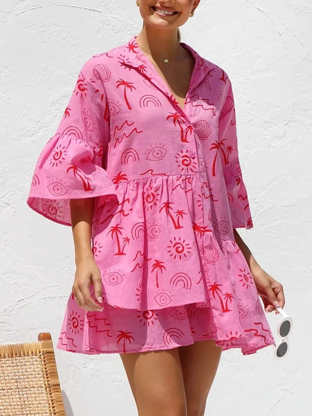 Button Detail Ruffled Hem Printed Mini Dress