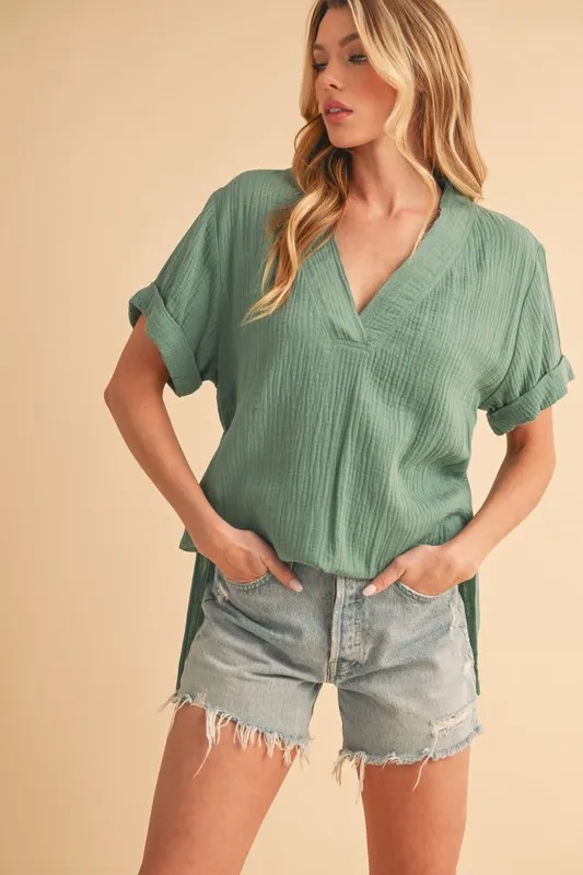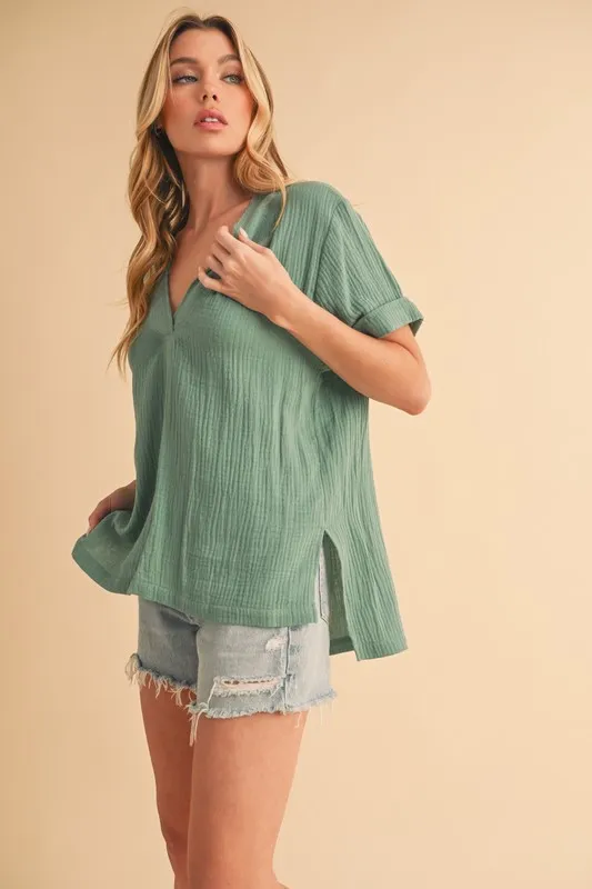 Aemi + Co Side Slit V-Neck Short Sleeve Blouse
