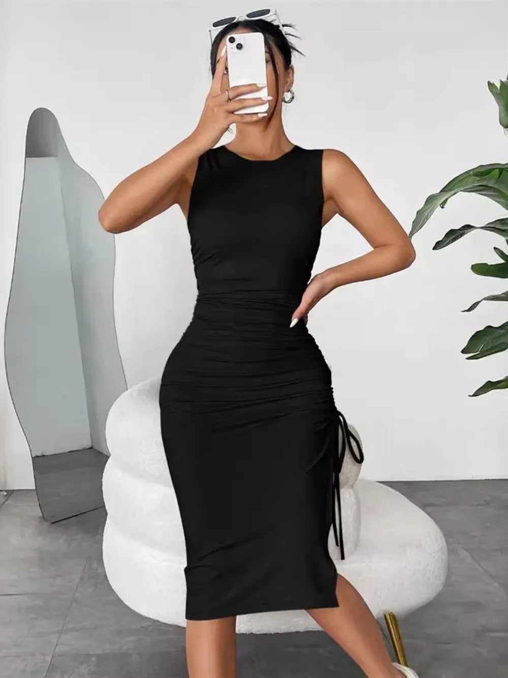 Sleeveless Ruched Bodycon Midi Dress with Side Drawstring