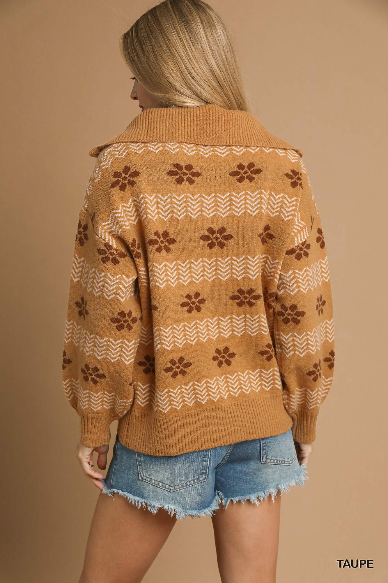 Umgee Floral Patterned Jacquard Quarter-Zip Pullover Sweater