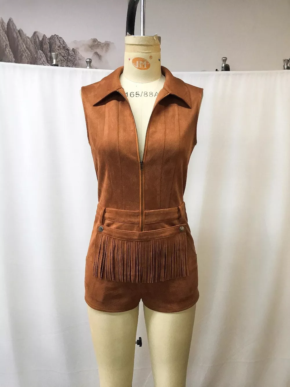 Full Size Fringe Zip Front Sleeveless Romper Plus Size