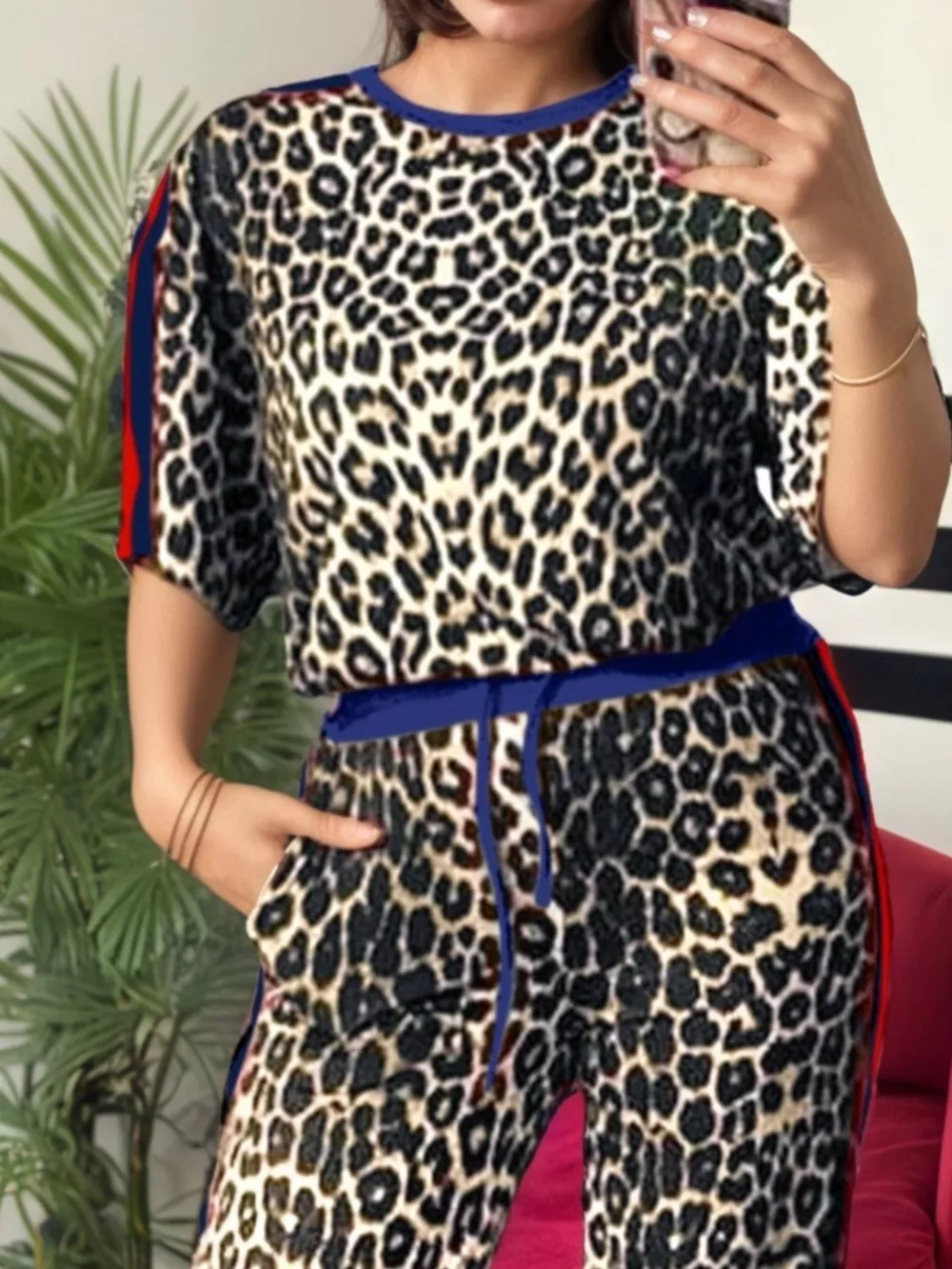 Leopard Round Neck Top and Pants Two-Piece Set