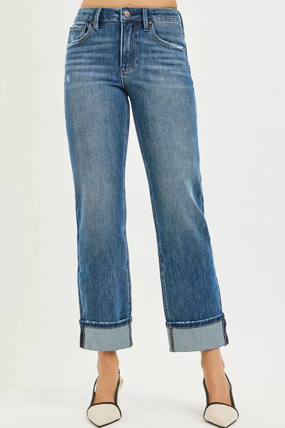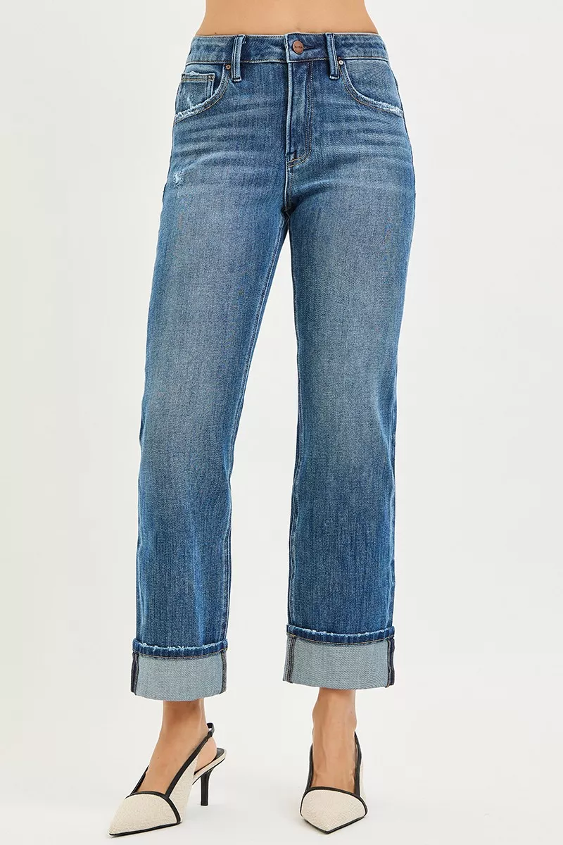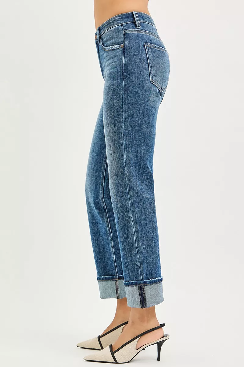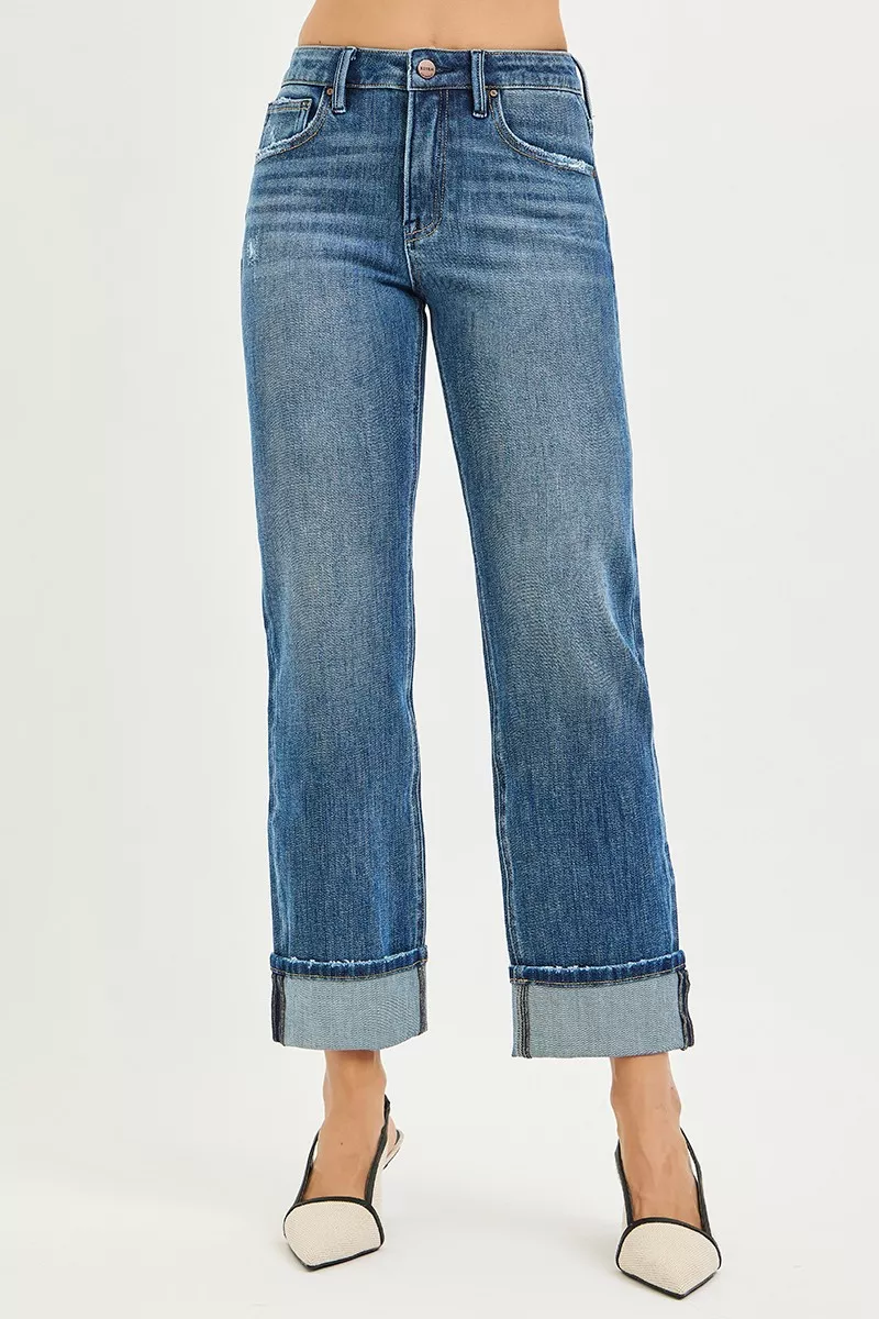 RISEN Full Size 4 Way Stretch Slouchy Straight Jeans with Cuffed Hem Plus Size
