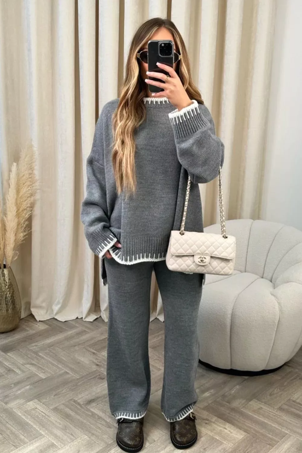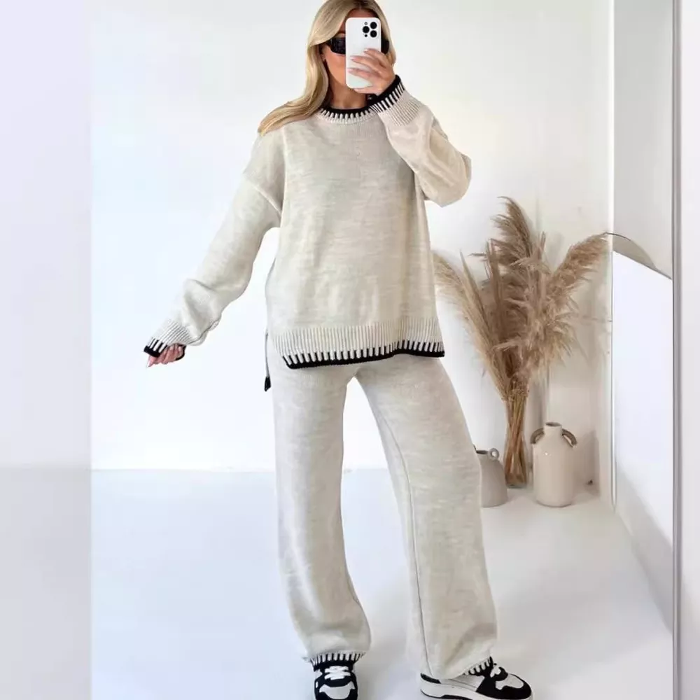 Contrast Trim Round Neck Top and Pants Sweater Set