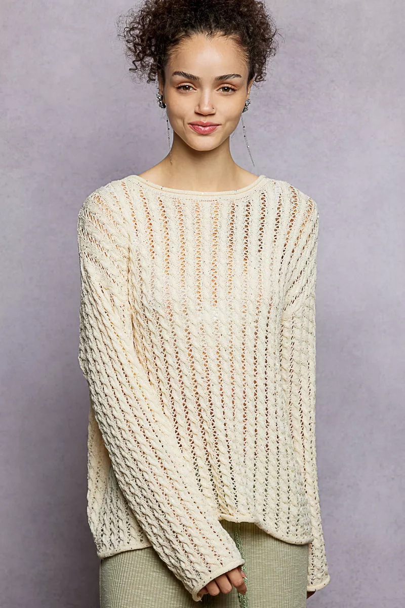 POL Openwork Round Neck Knit Top with Shiny Detail