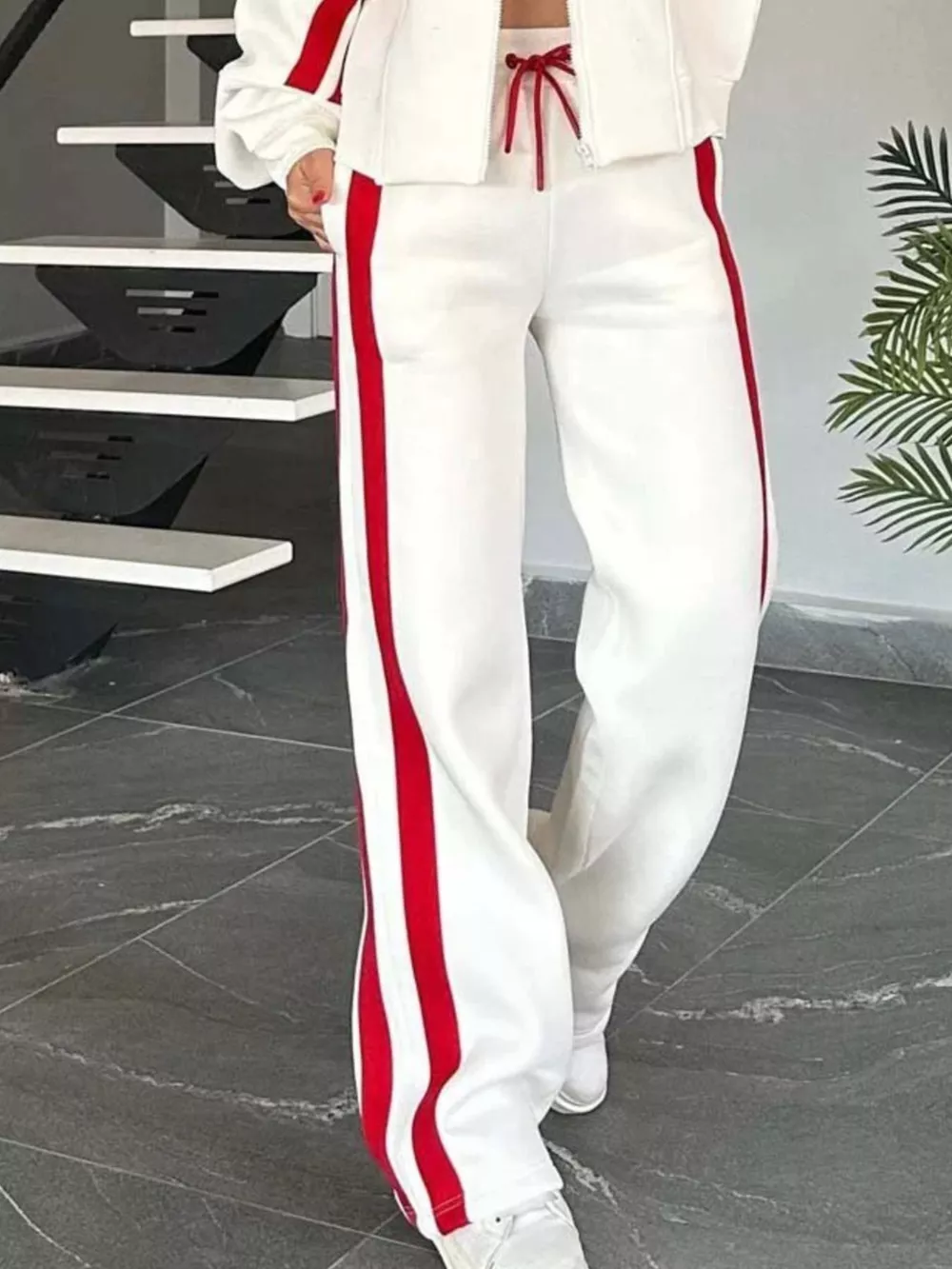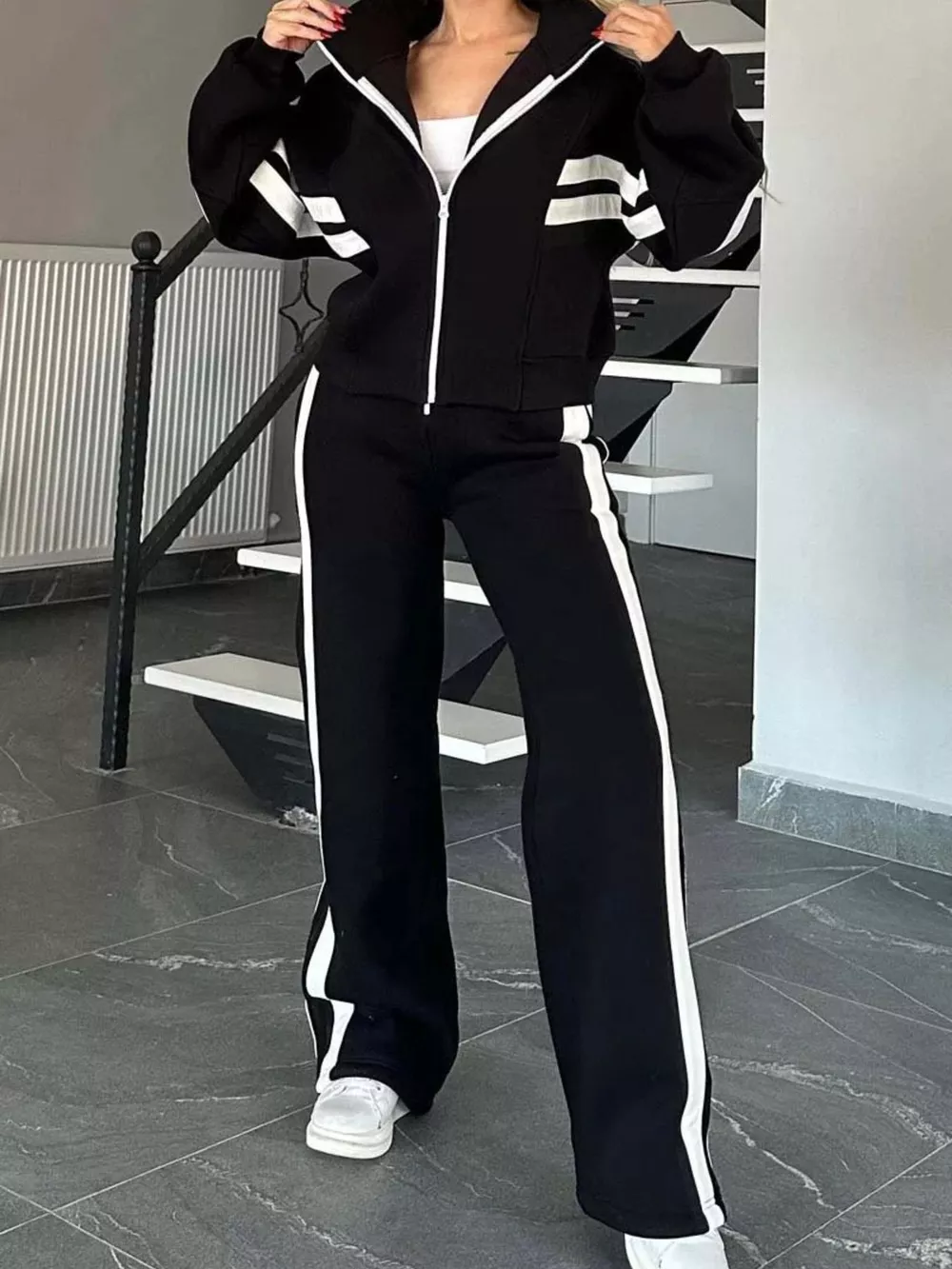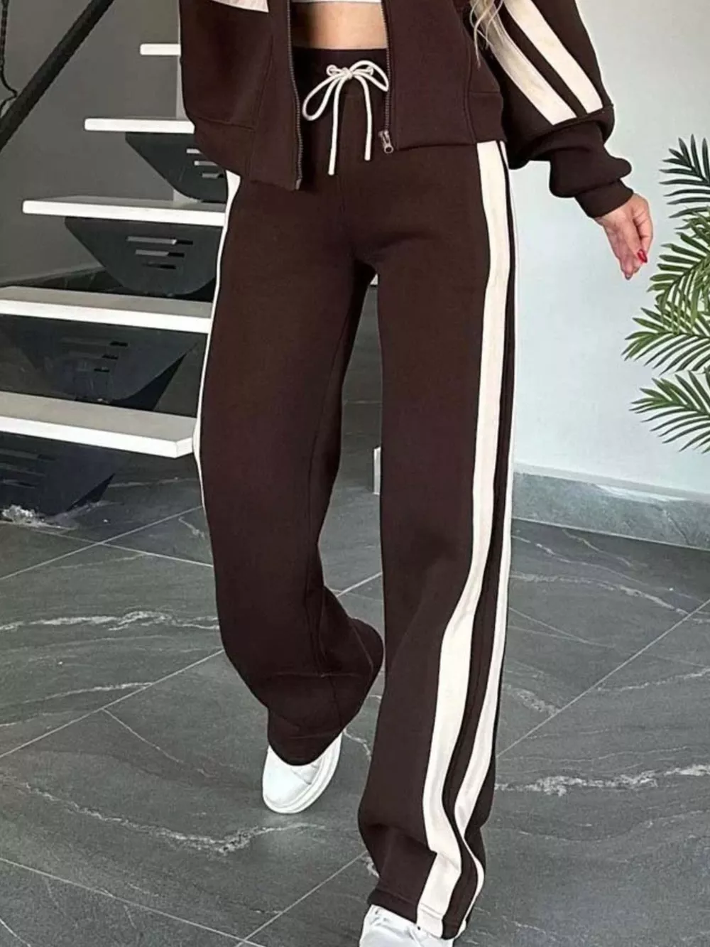Full Size Striped Zip Up Outerwear and Pants Set Plus Size