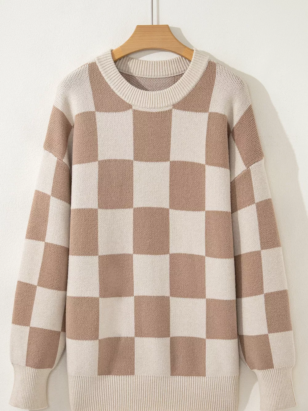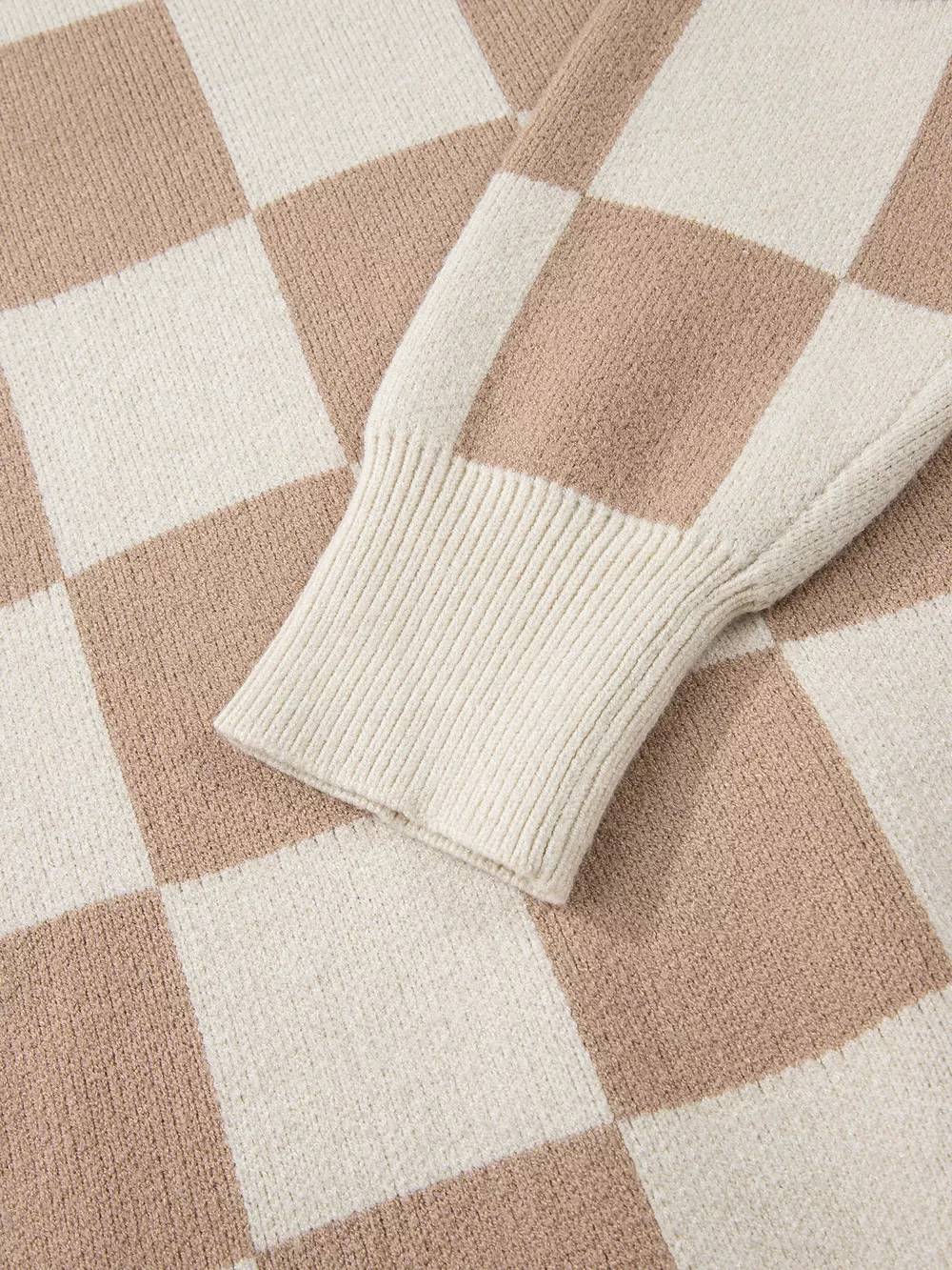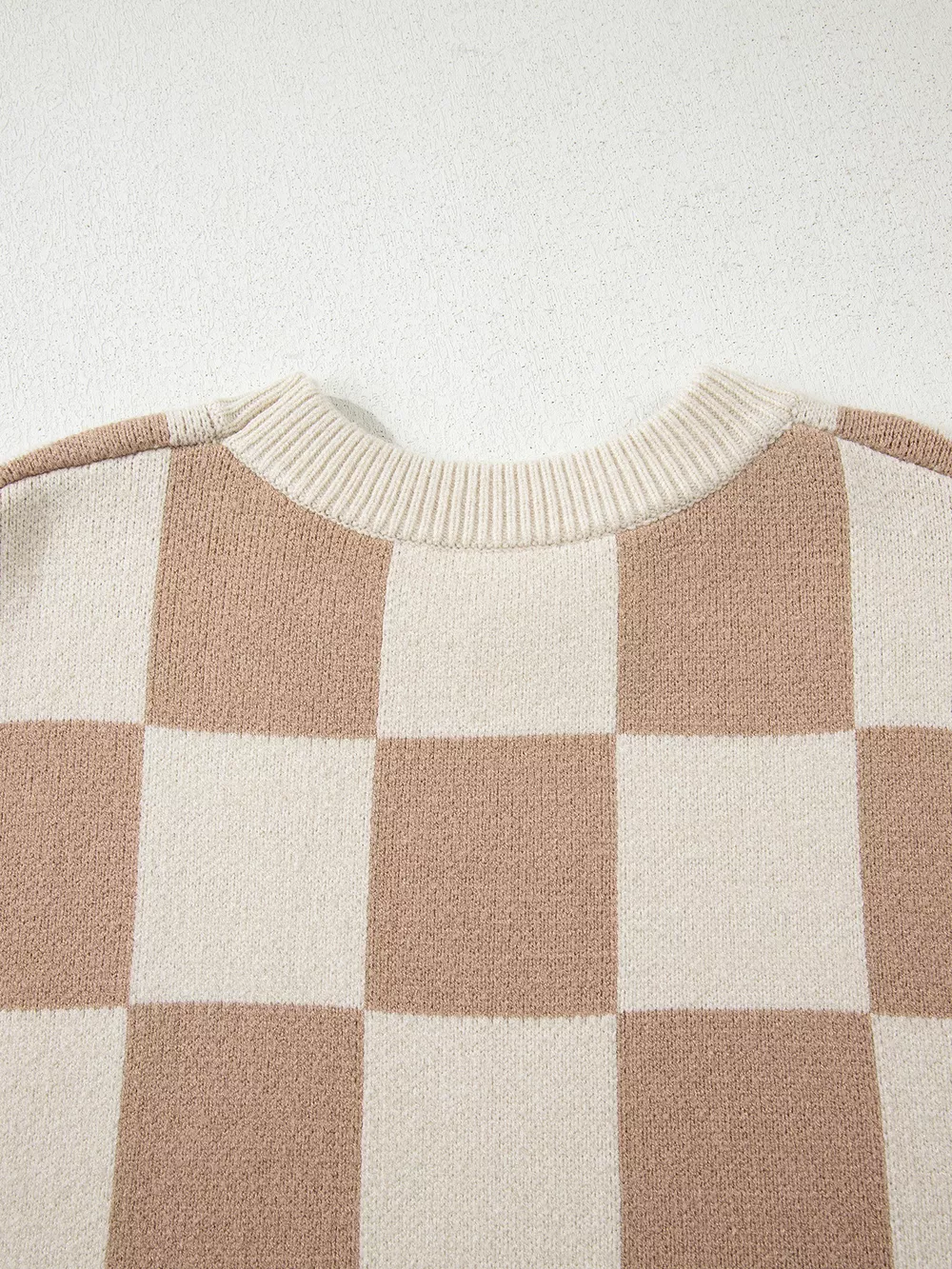Checkered Pattern Ribbed Trim Knit Baggy Sweater