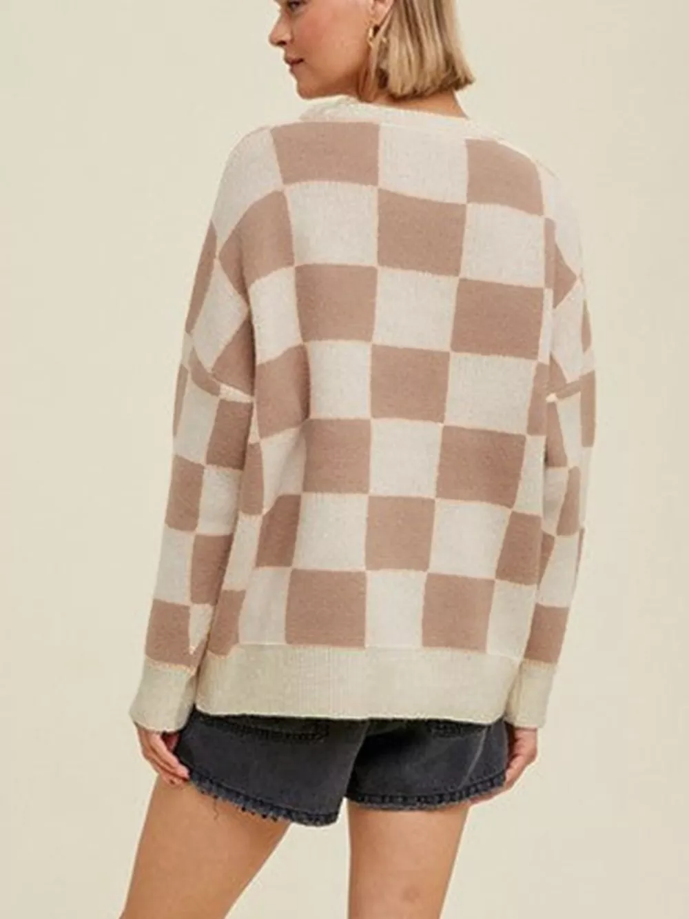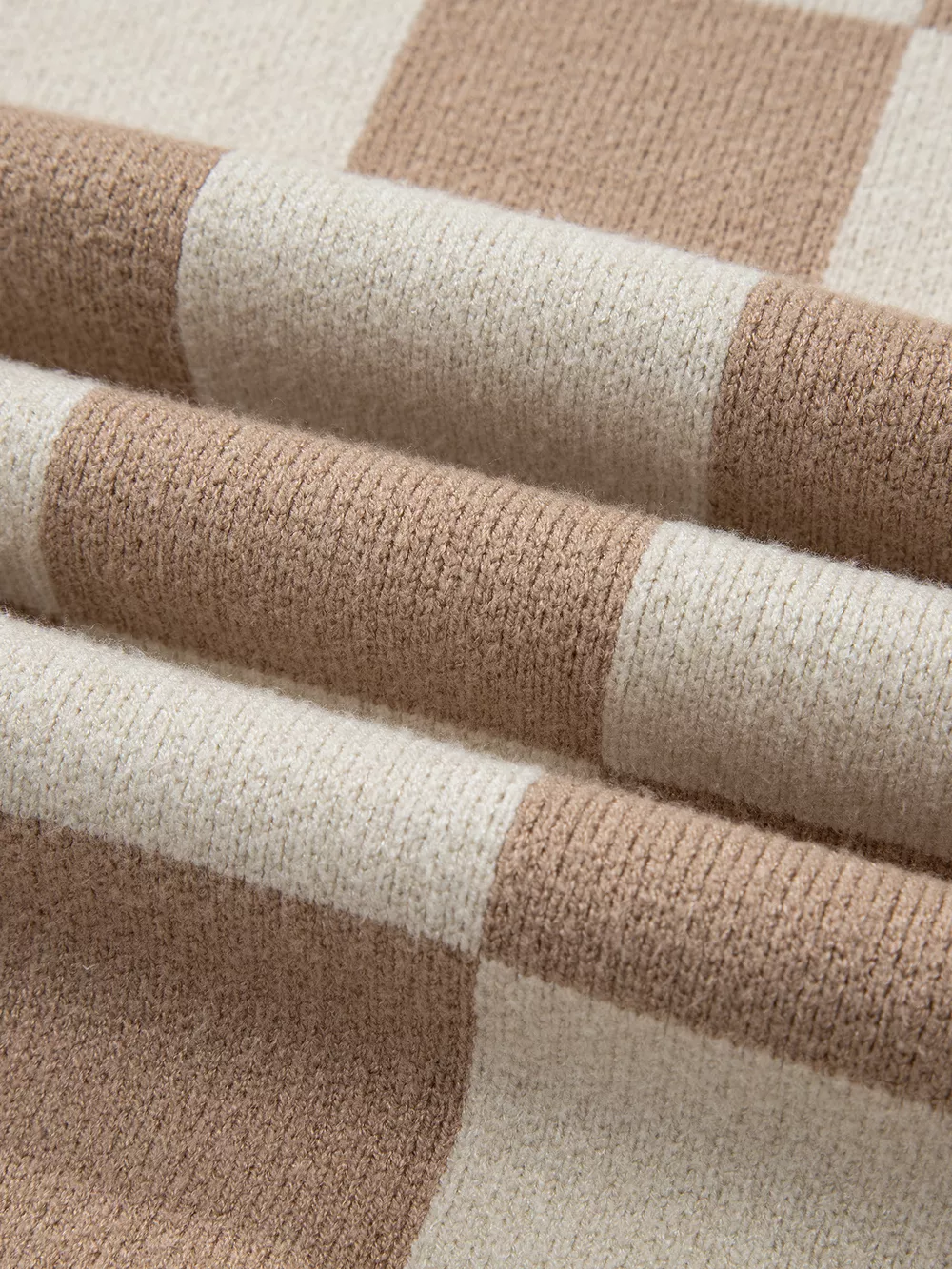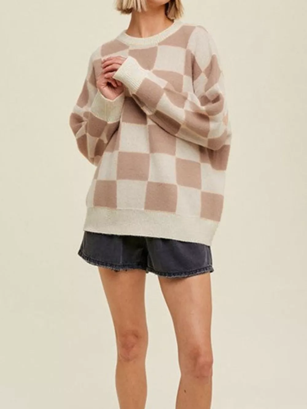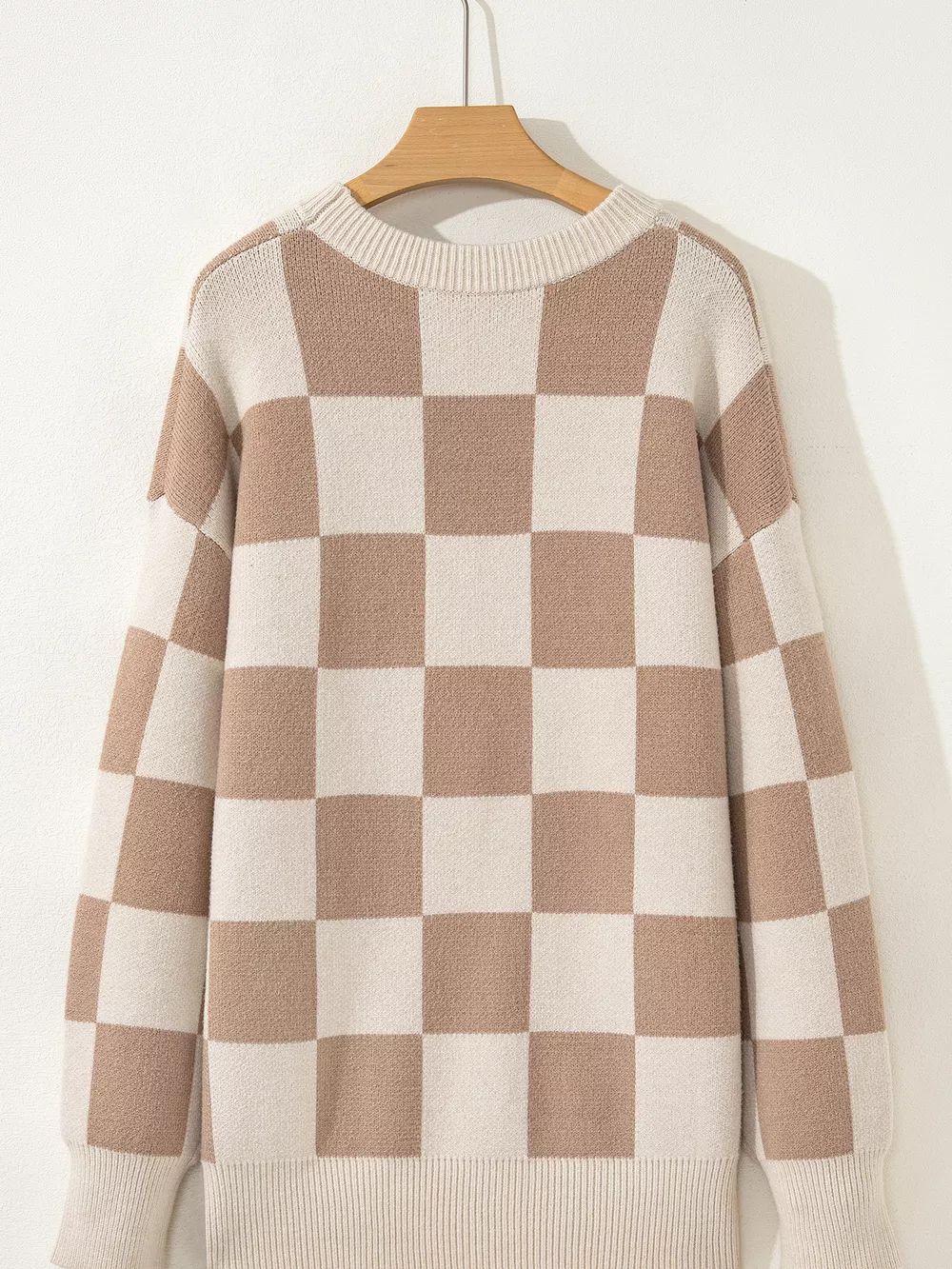 Checkered Pattern Ribbed Trim Knit Baggy Sweater