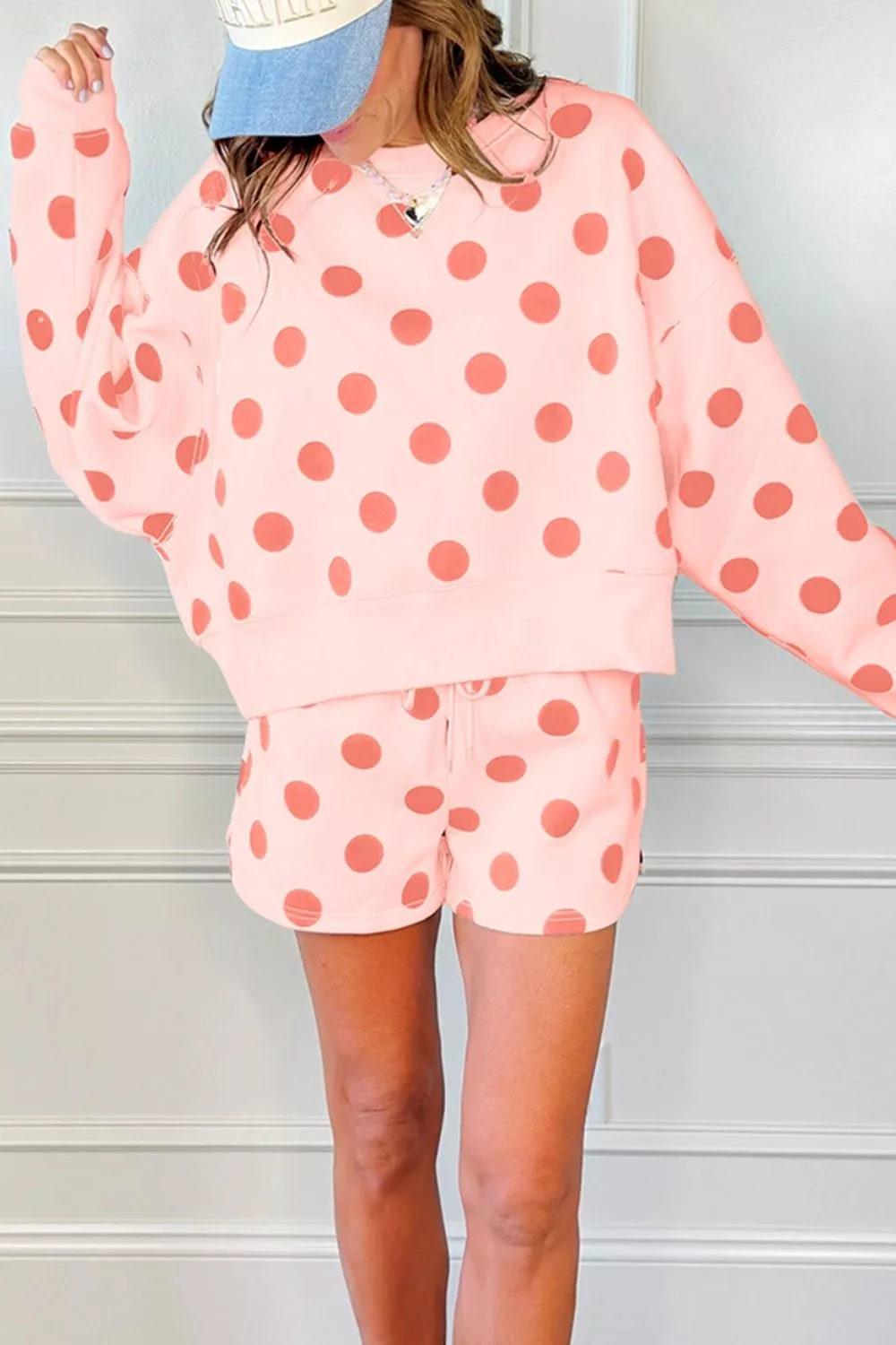 Polka Dot Print Drop Shoulder Pullover Drawstring Shorts Set