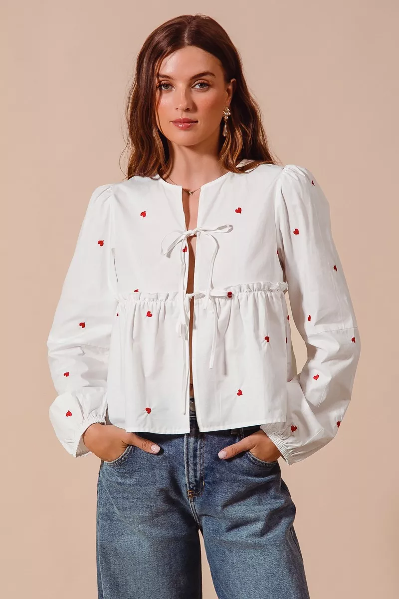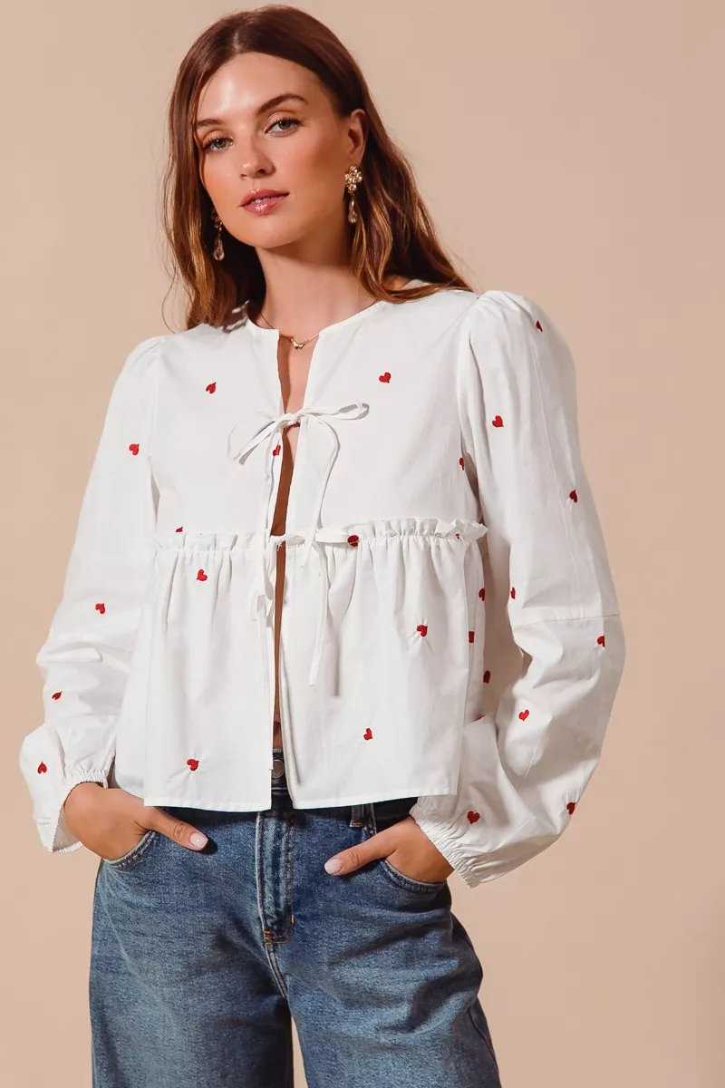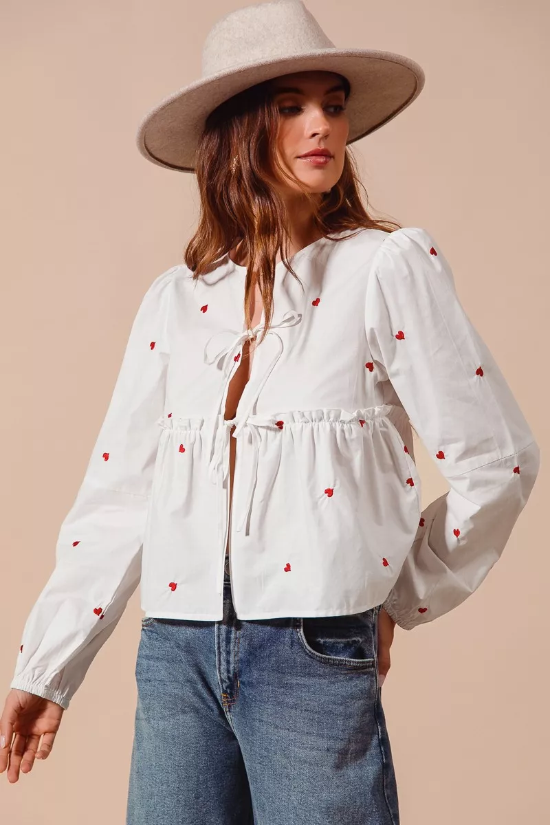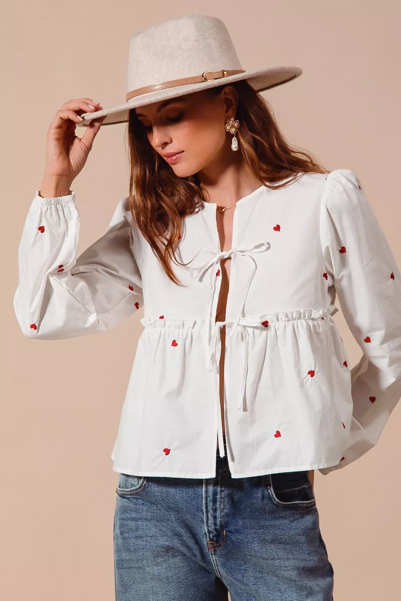 SO ME Front Tie Heart Embroidered Blouse With Puff Sleeve