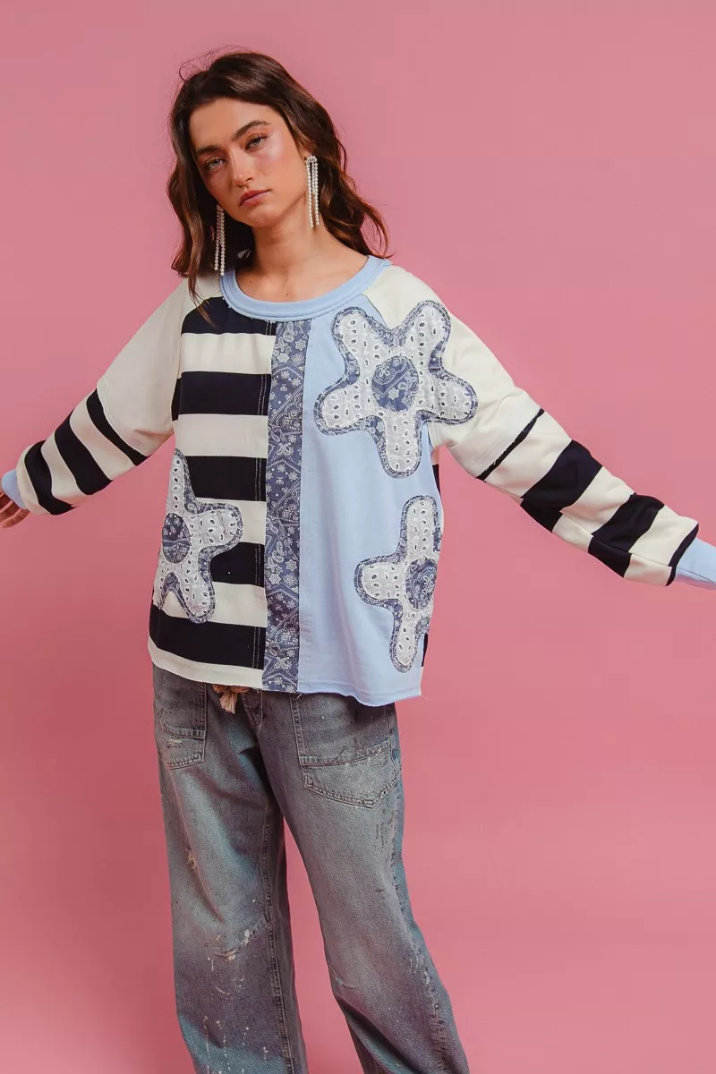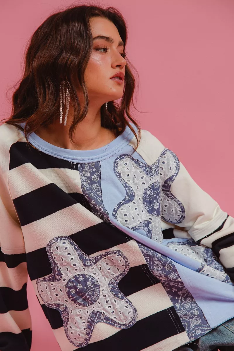 BiBi Patchwork Striped Round Neck Sweatshirt
