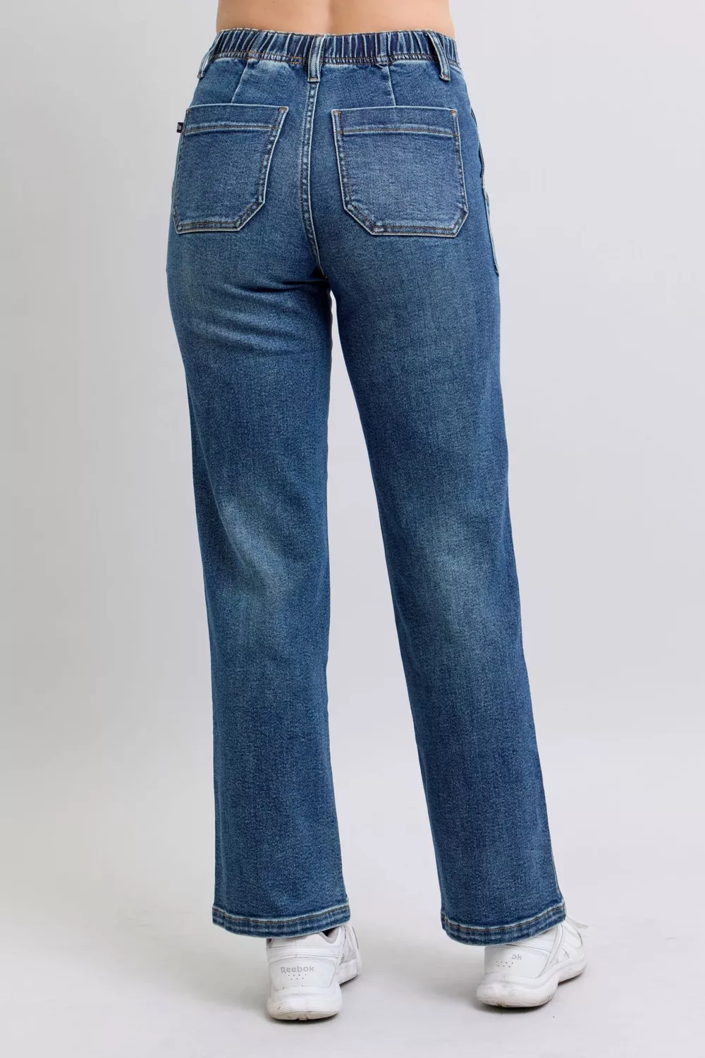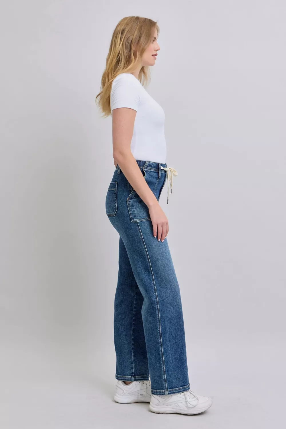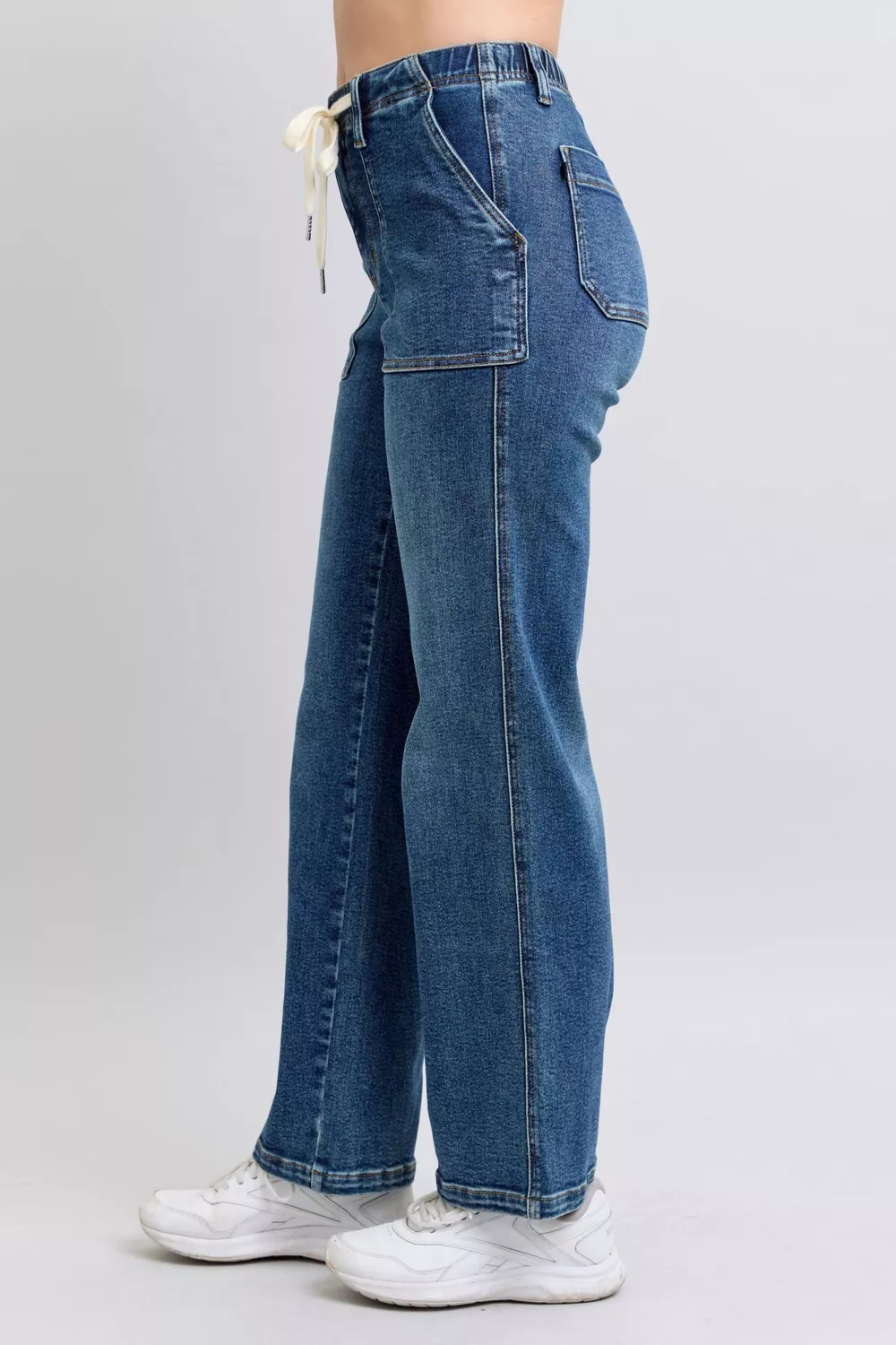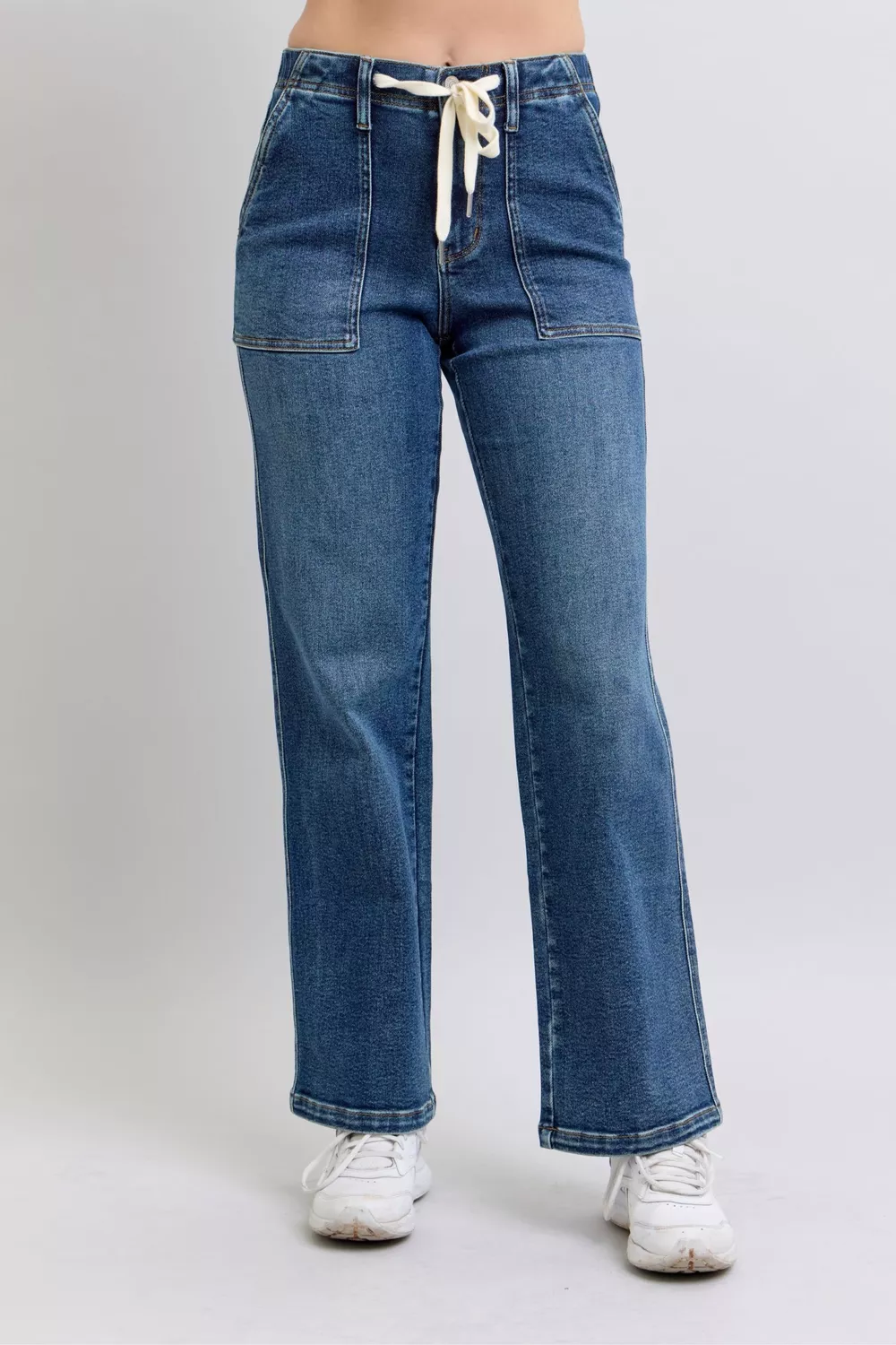 The Drawstring Straight Jeans with Pockets are a comfortable and stylish choice for a casual day out. The drawstring waist adds a trendy and versatile element to these jeans. Featuring convenient pockets for functionality, these jeans are both practical and fashionable. Pair them with a basic tee or a cozy sweater for a laid-back look. Elevate your everyday style with these on-trend drawstring straight jeans.