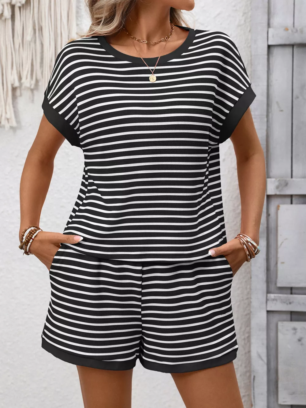 Striped Casual Round Neck Top and Shorts Set