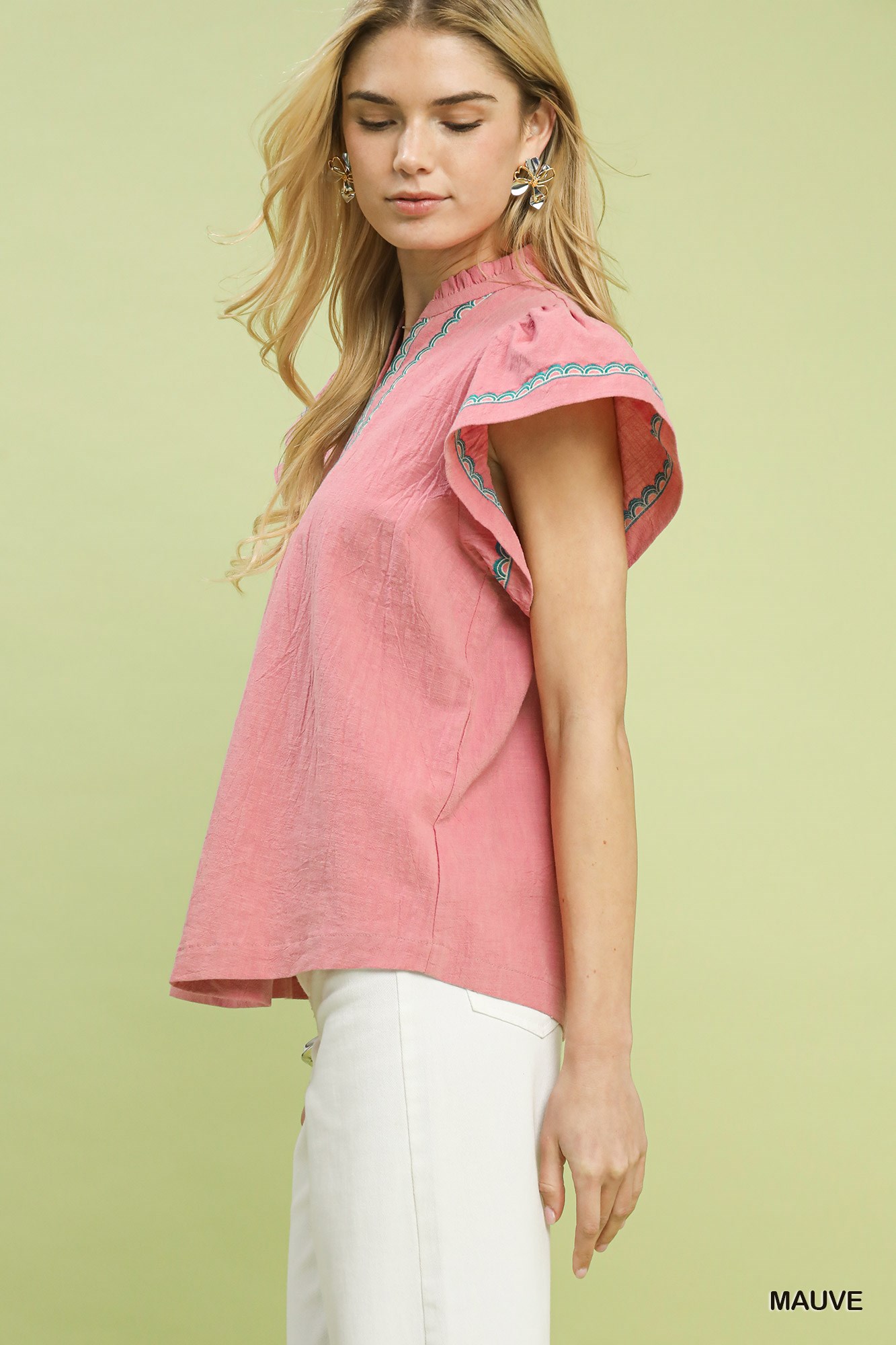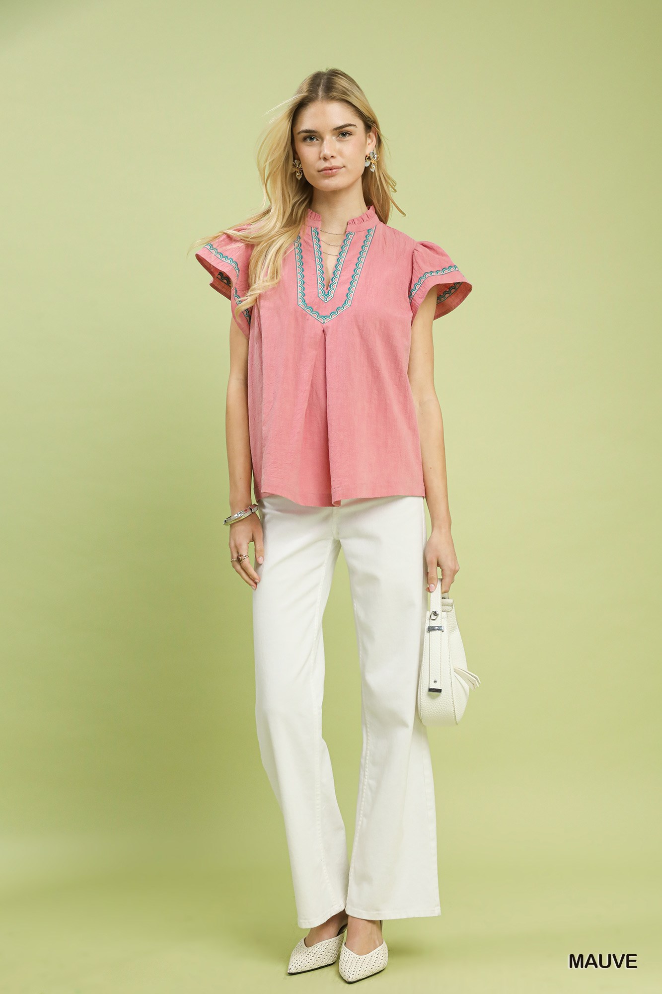 Upgrade your look with the chic Embroidered Flutter Sleeve Blouse. The split V-neck with embroidered trim adds a stylish detail to this top. Featuring flutter sleeves for a touch of femininity, this blouse offers a flowy silhouette that is perfect for both casual and dressy occasions. Please note that this blouse is not lined, ensuring a lightweight and comfortable fit. Embrace effortless style with this versatile and fashionable piece.