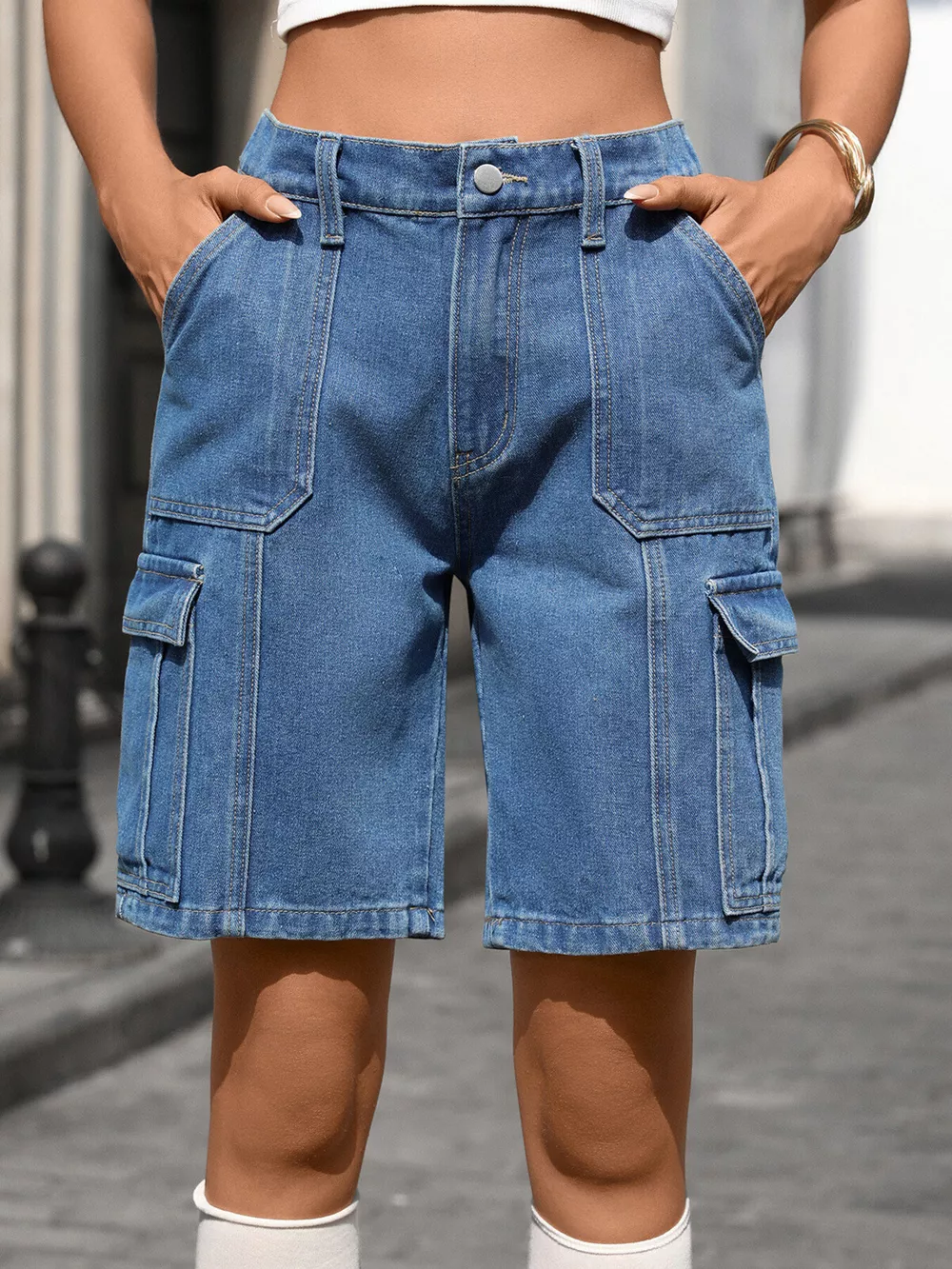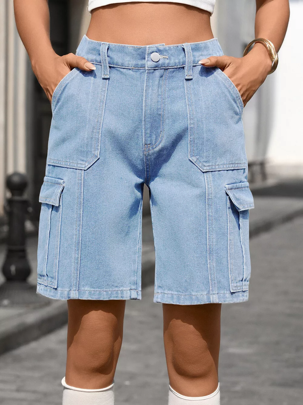 High-Waisted Wash Denim Shorts