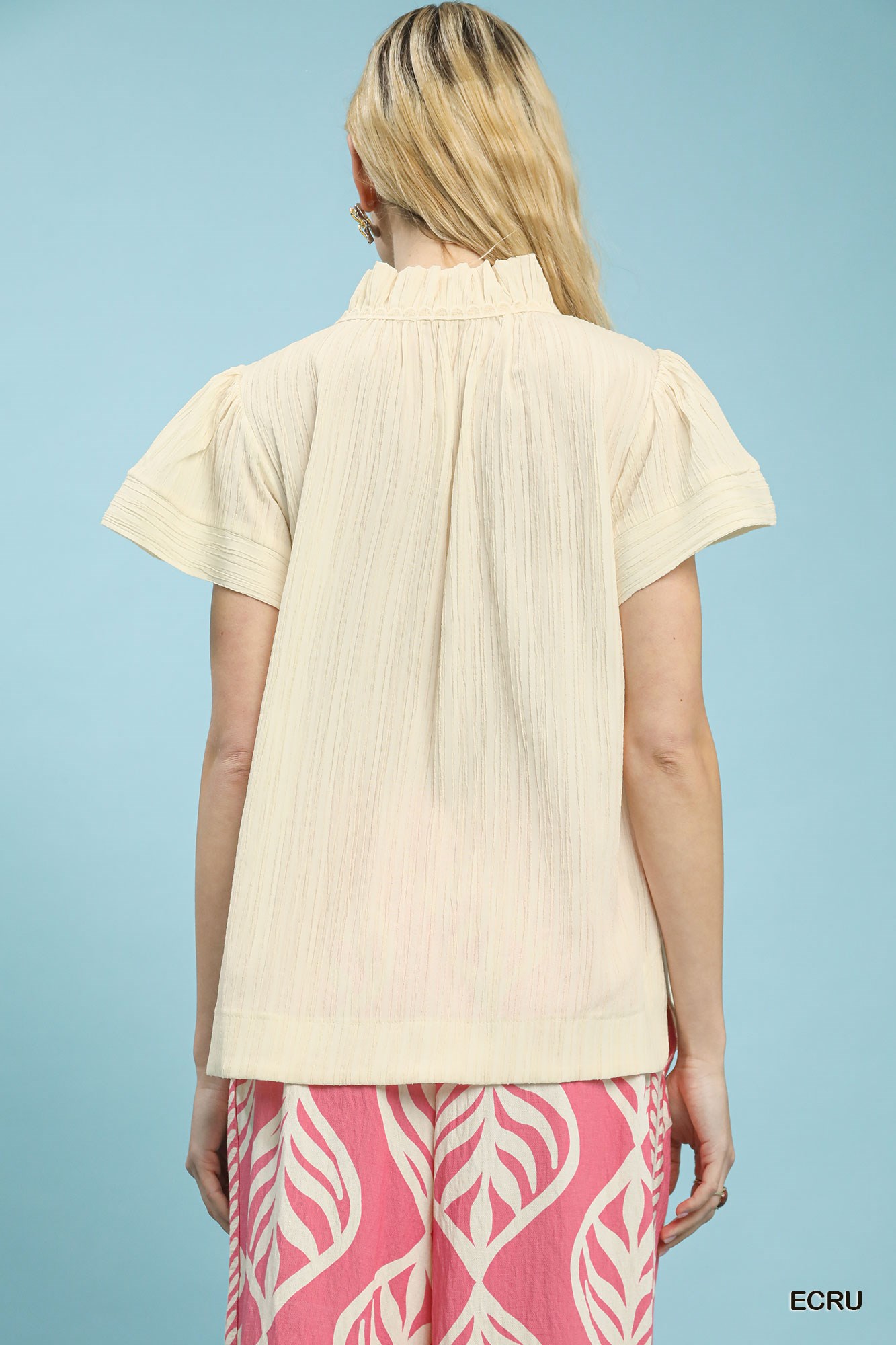 This stylish blouse features a split V-neck with a soft ruffle collar, adding a touch of femininity to the design. The flutter sleeves create a flowy and elegant look, perfect for both casual and dressy occasions. The subtle texture of the fabric adds depth and interest to the overall appearance. This blouse is versatile and can be easily paired with your favorite bottoms for a complete and chic outfit. Please note that this blouse is not lined for a lightweight and breathable feel.