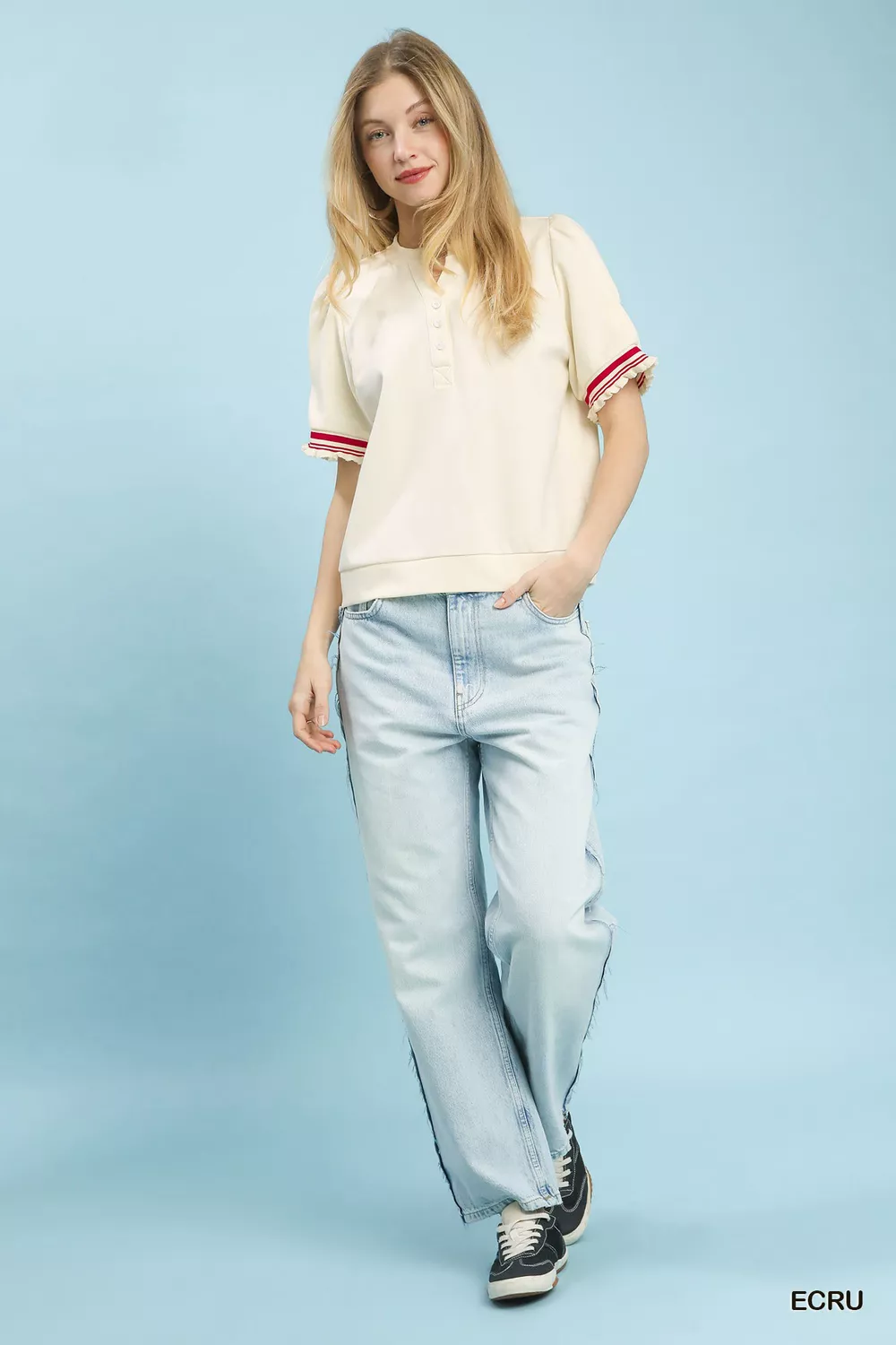 Umgee Puff Sleeve Button Front Top with Contrast Trim