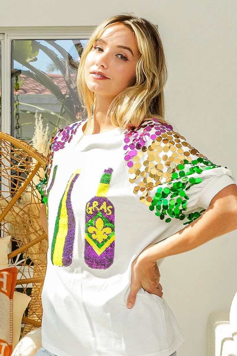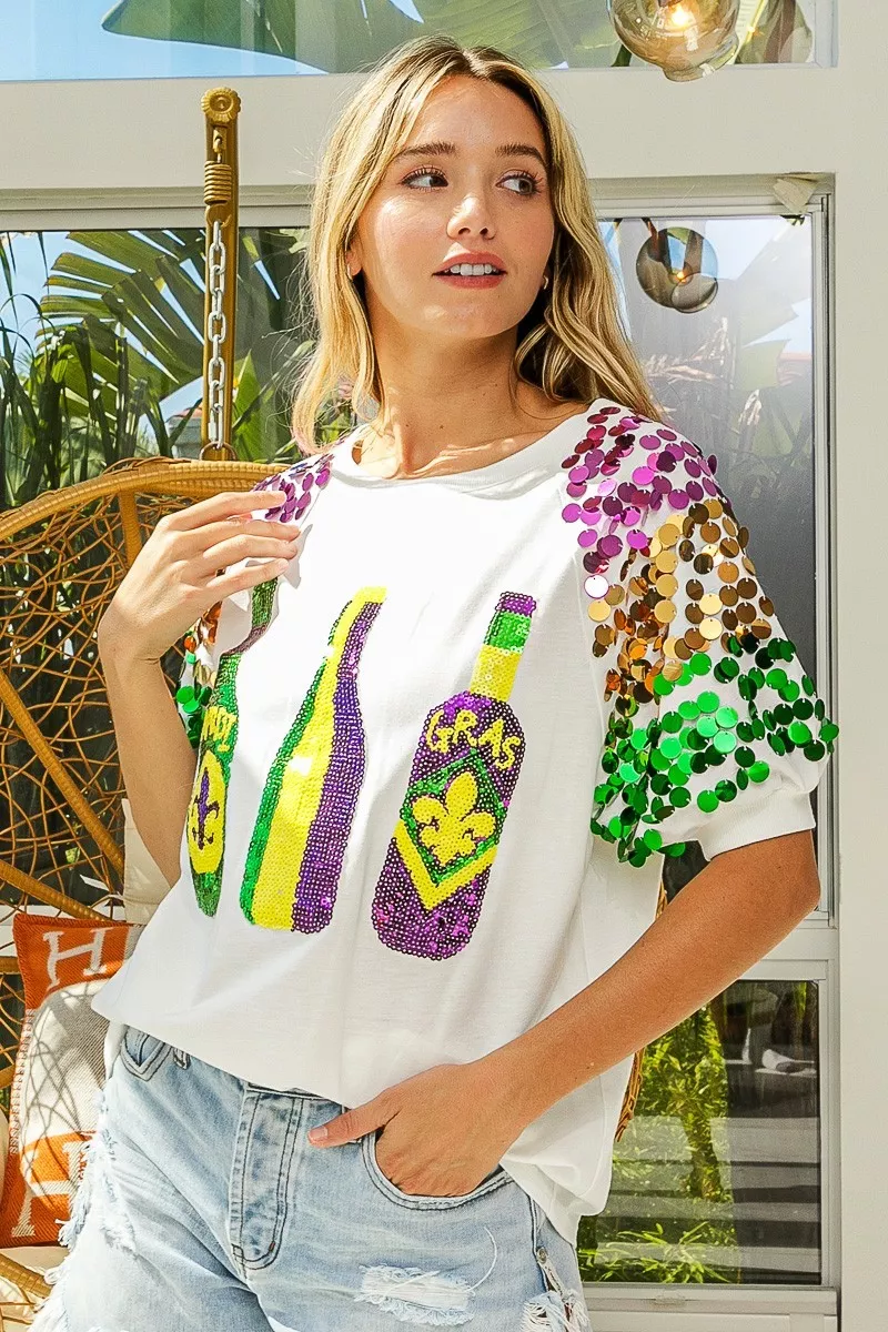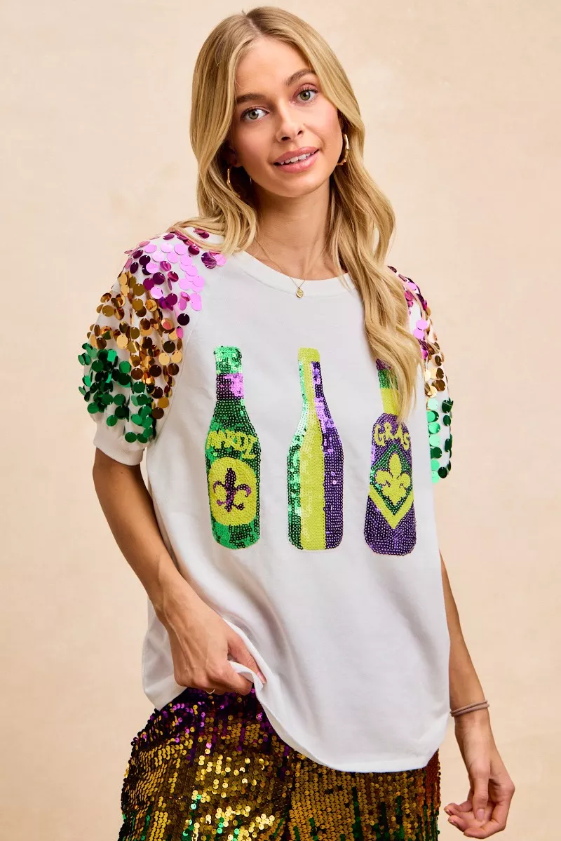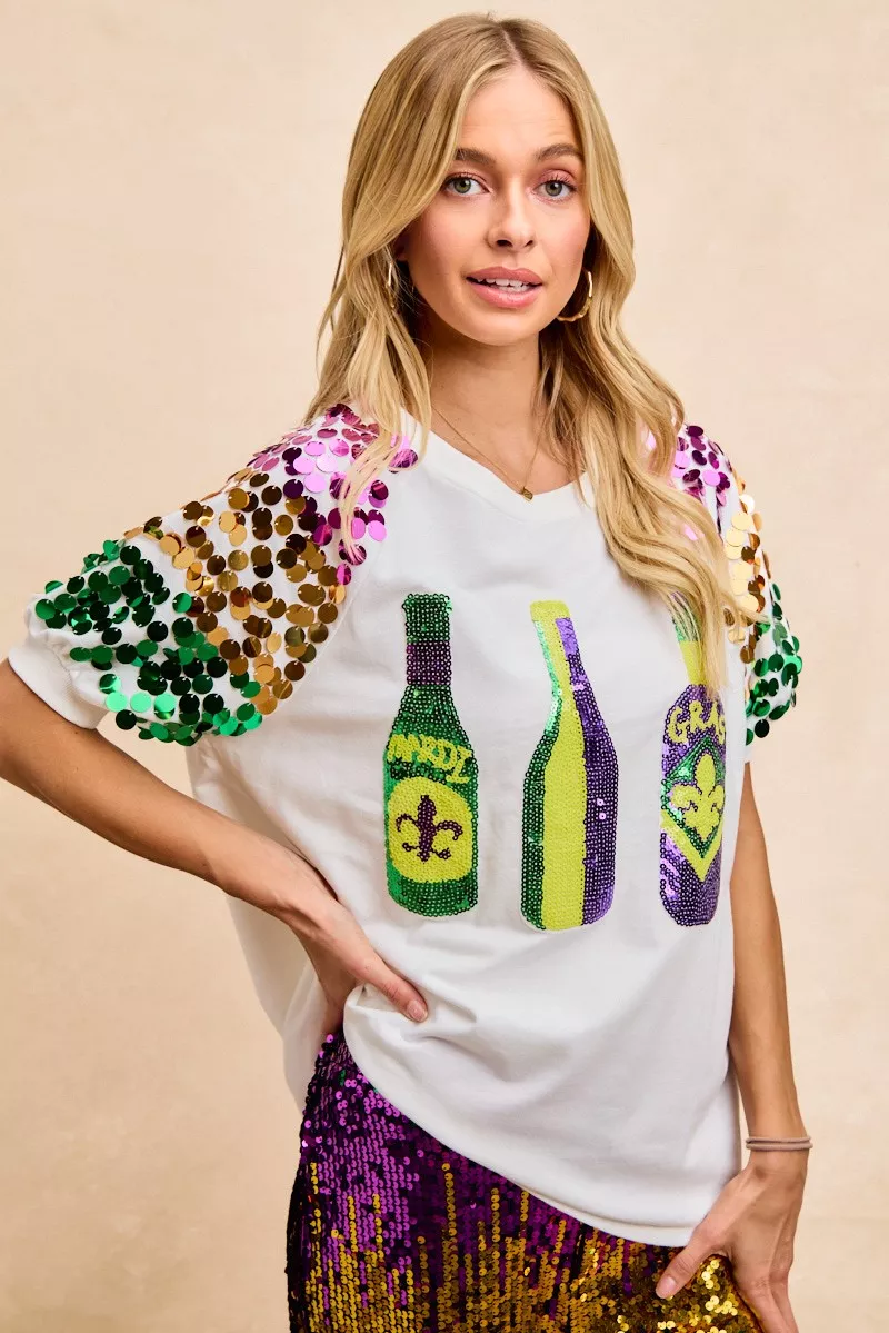 BiBi Sequin Mardi Gras Bottles Spangled Sleeve Top