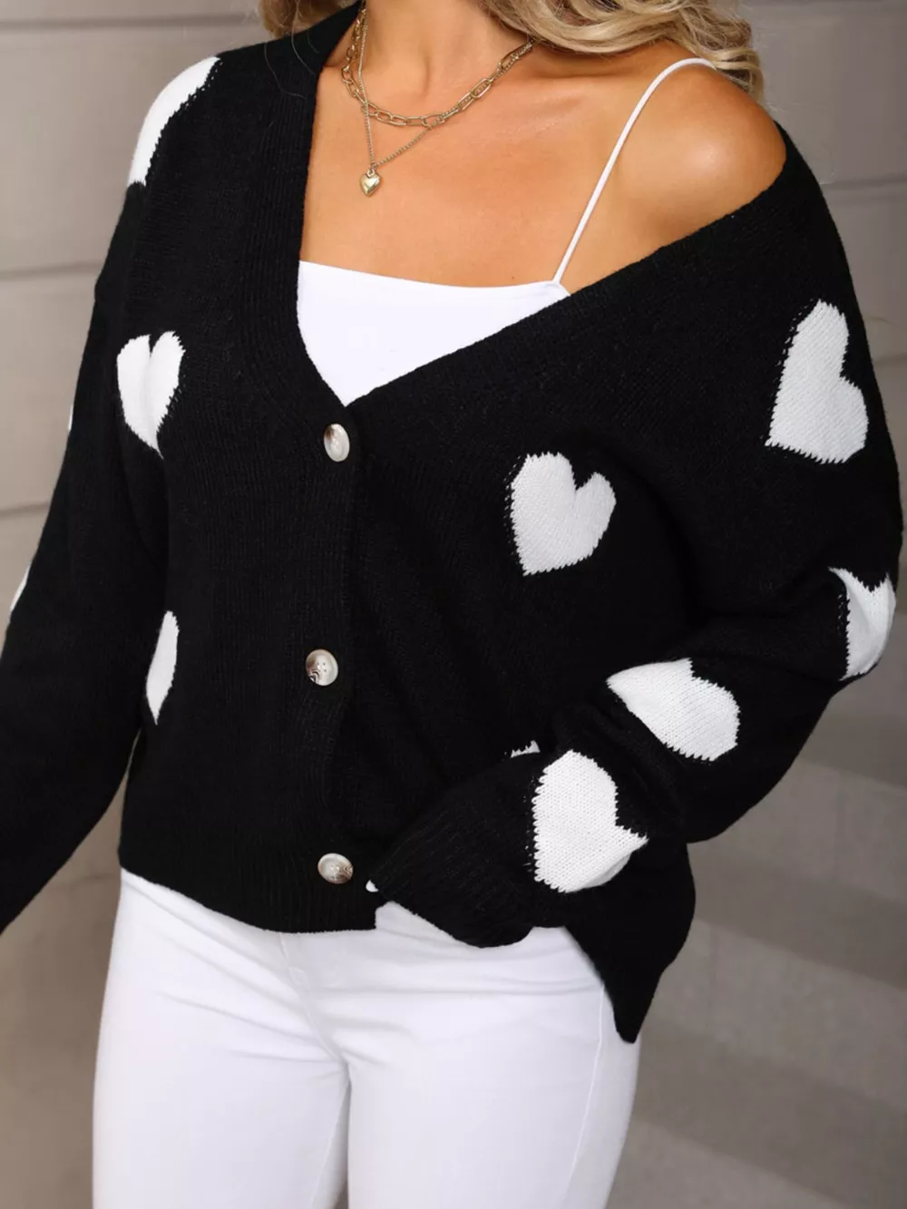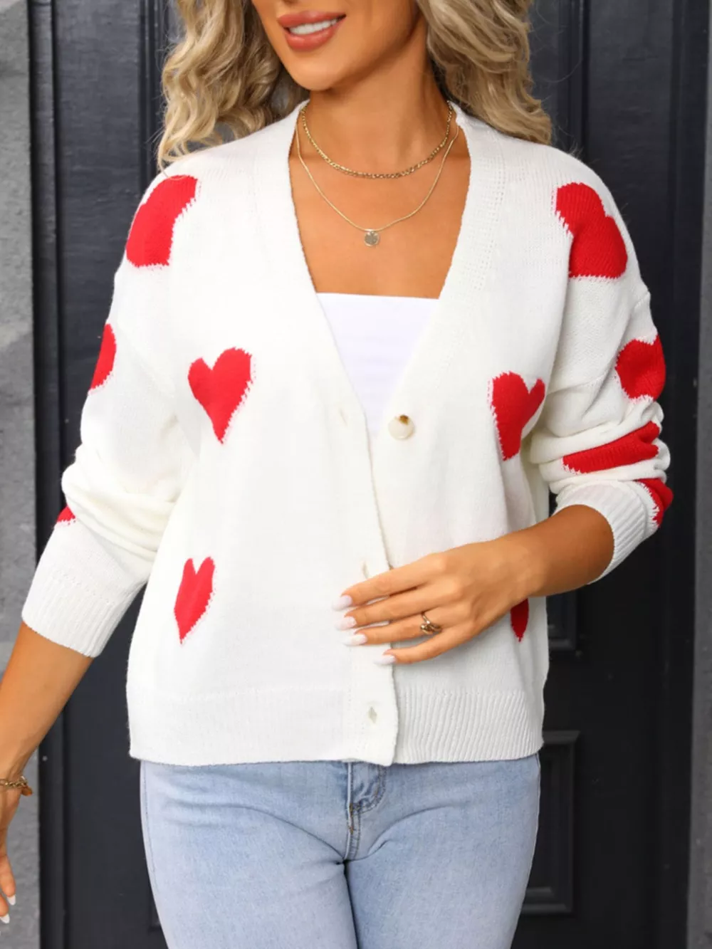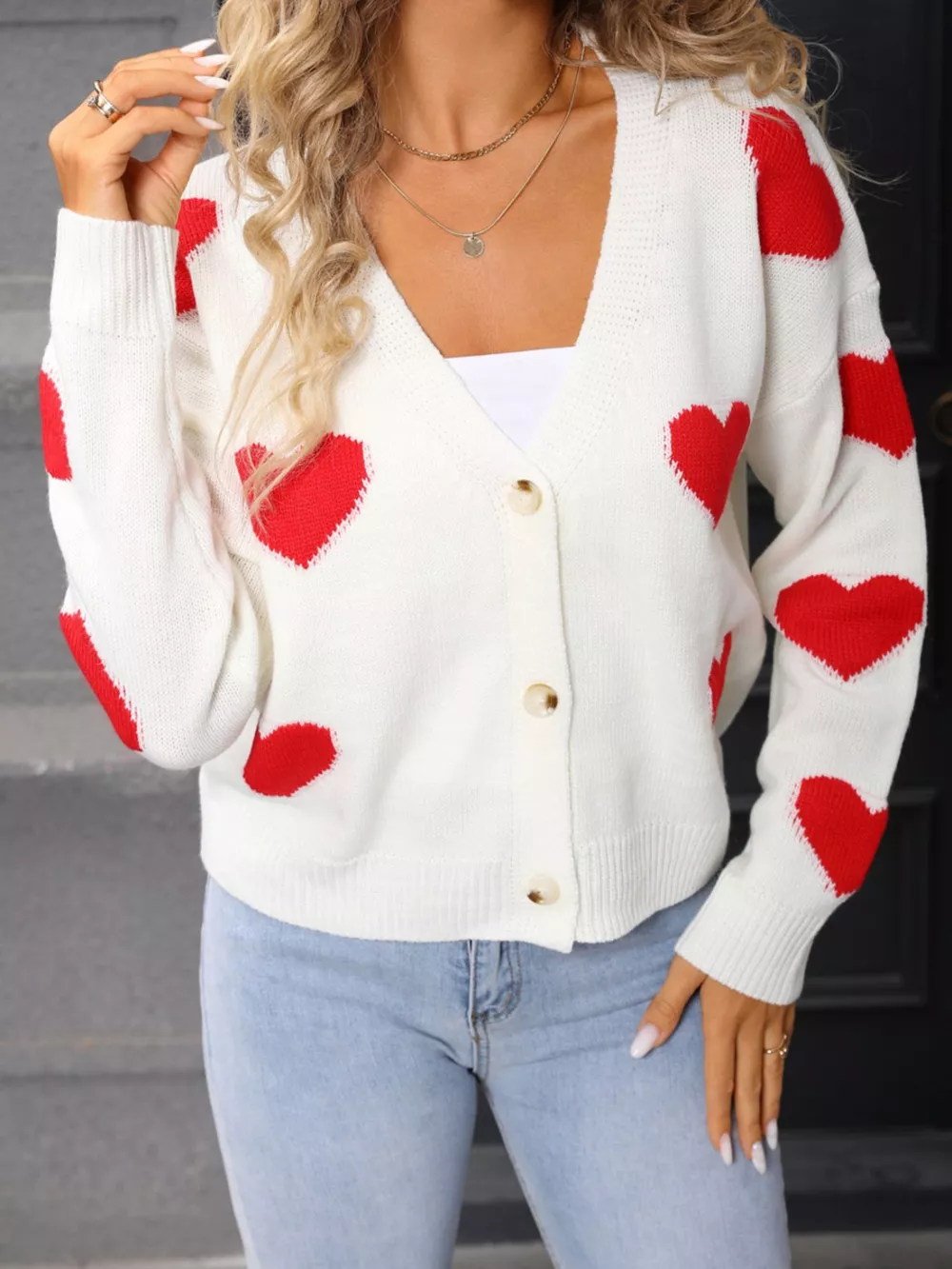 Valentine's Day Heart Pattern Button-Up Knit Cardigan