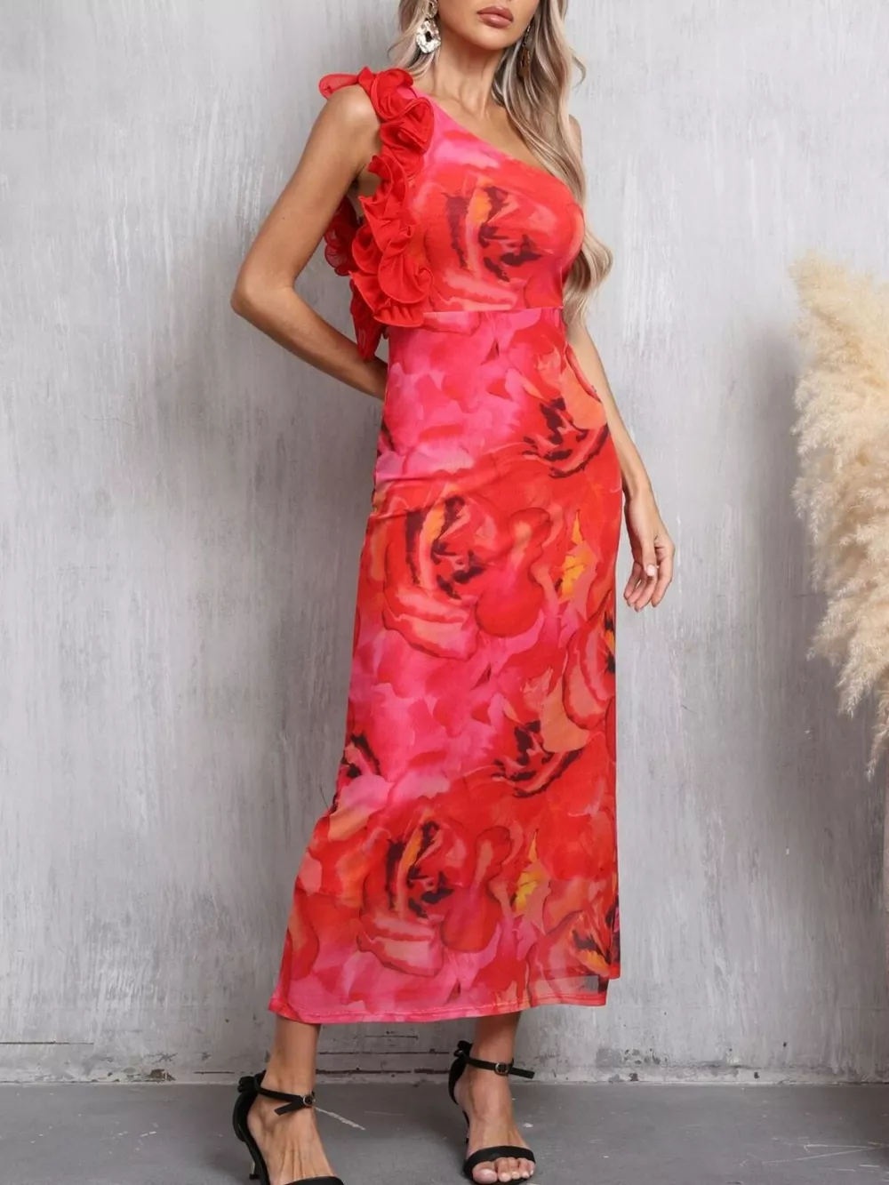 Floral Print One Shoulder Ruffle Trim Dress