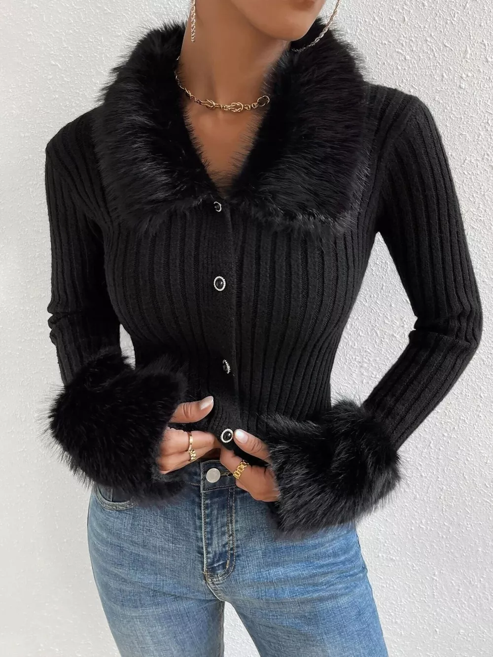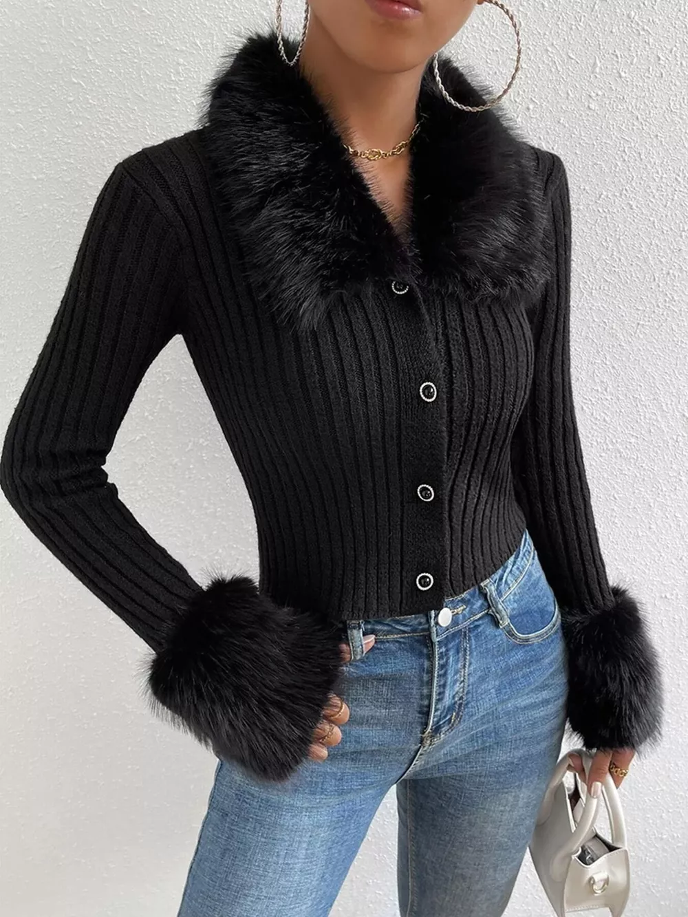 Faux Fur Trim Ribbed Knit Cropped Cardigan