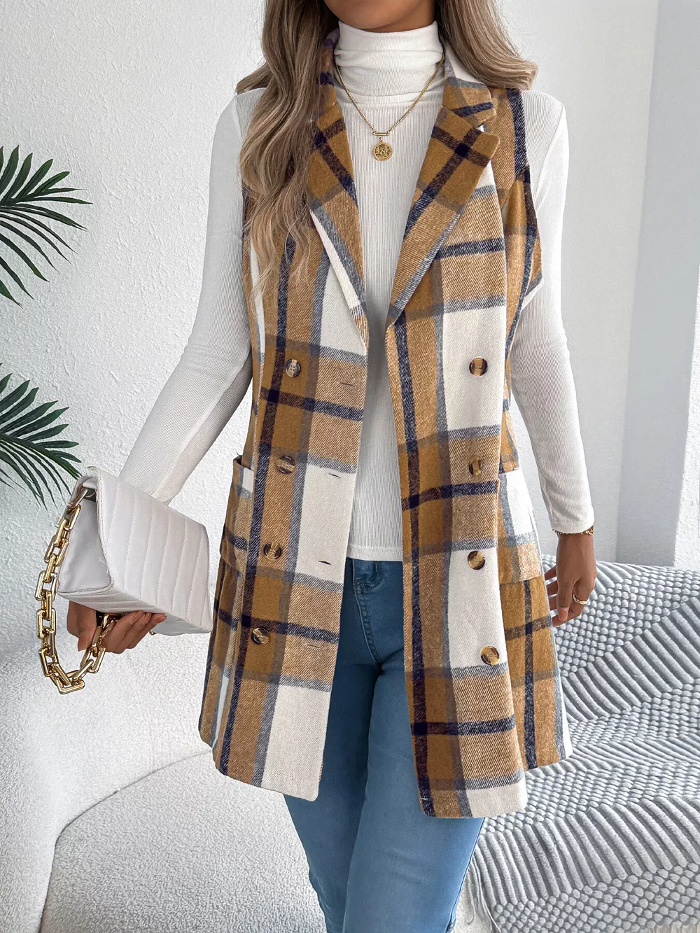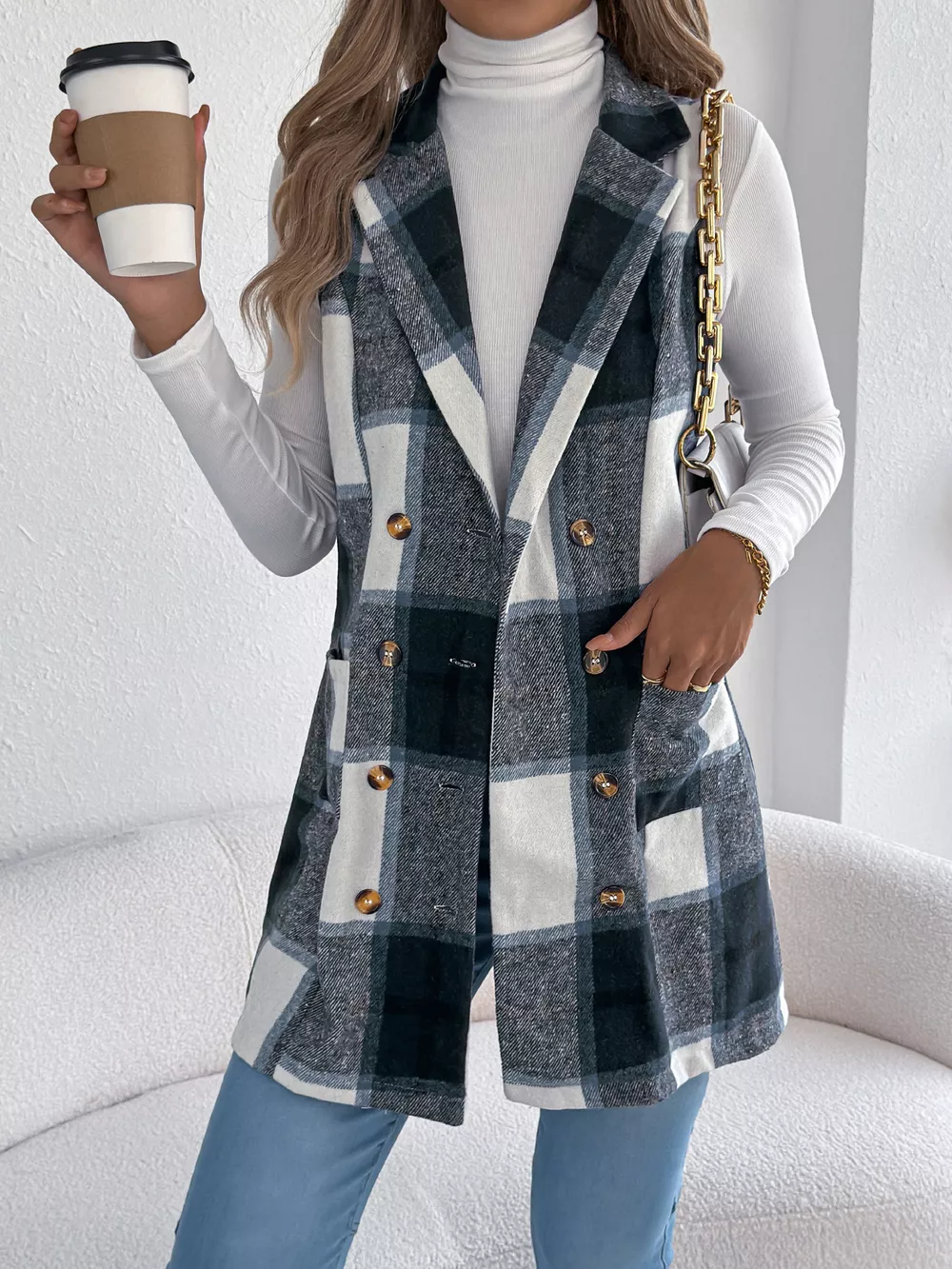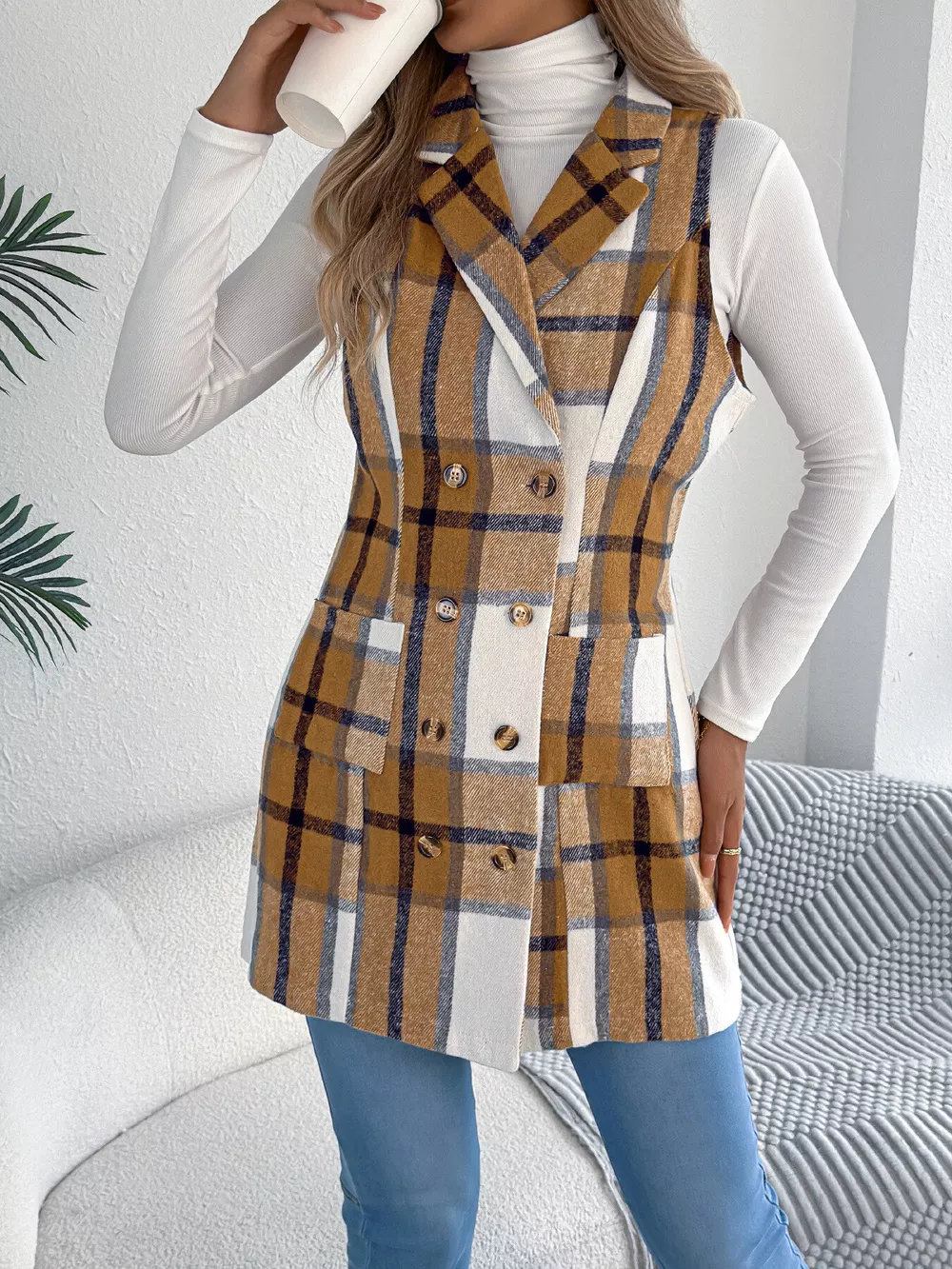 Plaid Double-Breasted Vest Coat