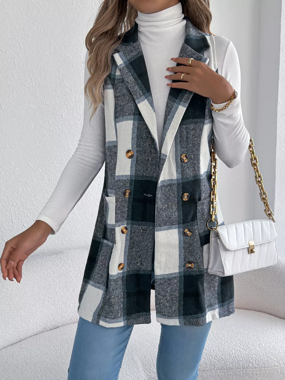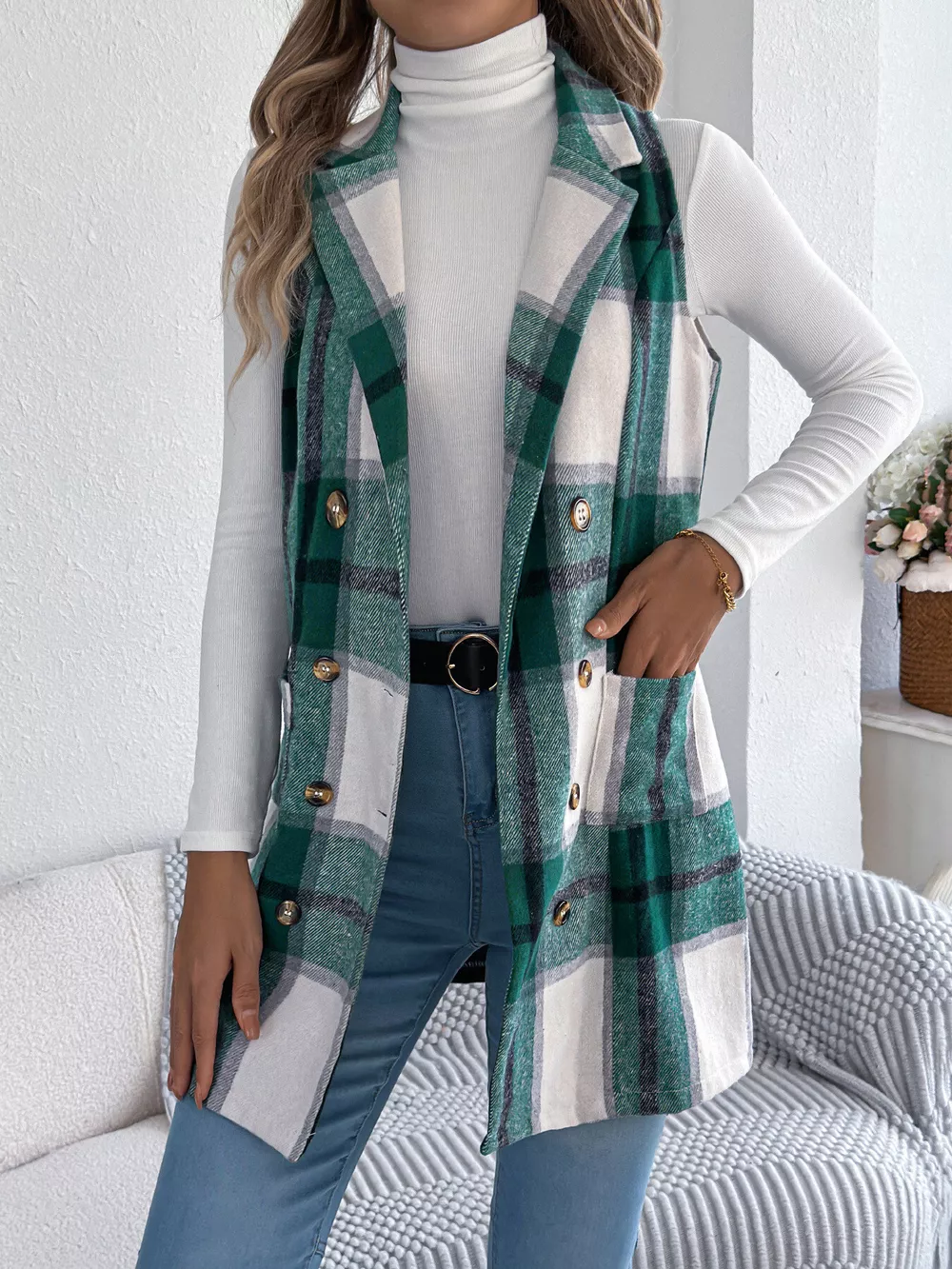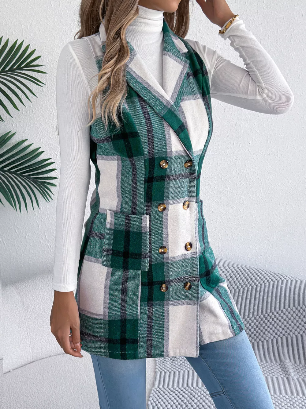 Plaid Double-Breasted Vest Coat