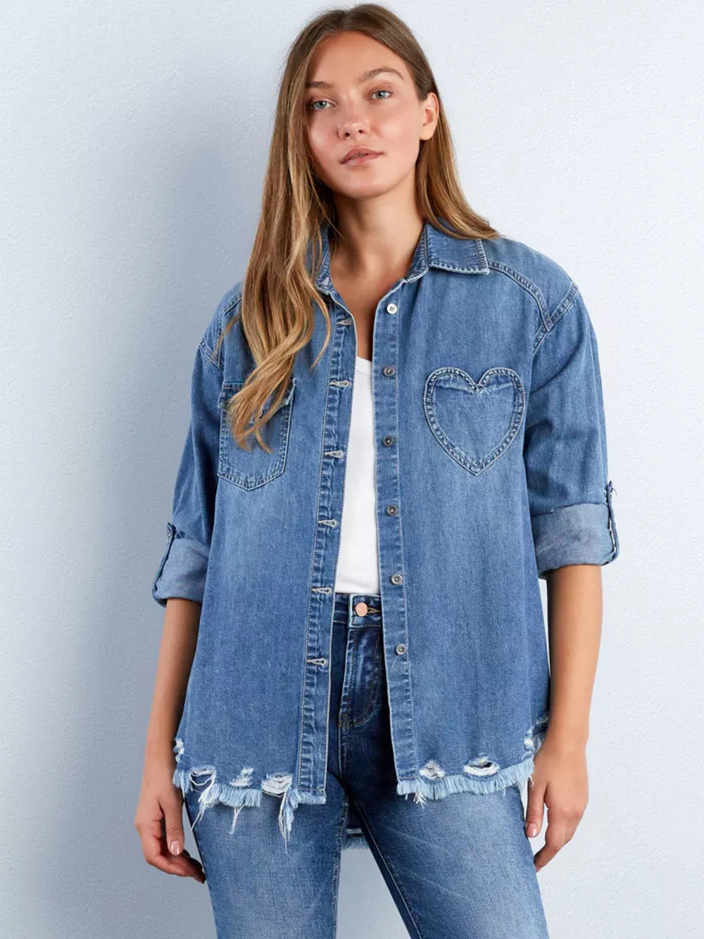 Frayed Hem Roll-Up Sleeve Denim Shirt
