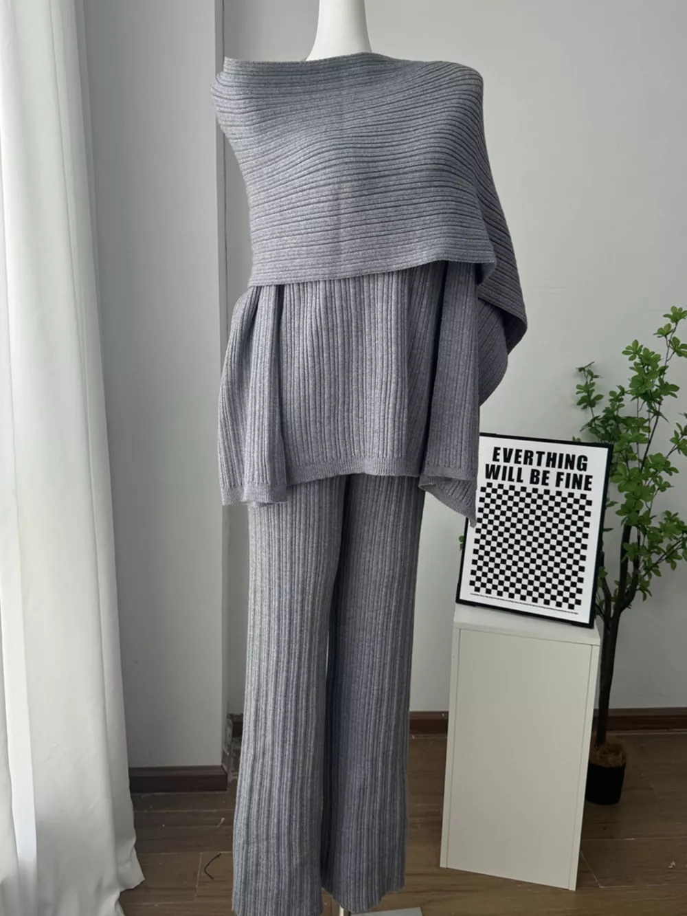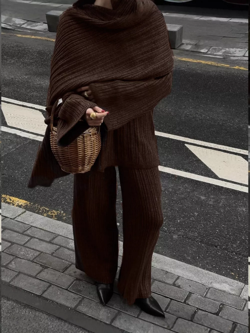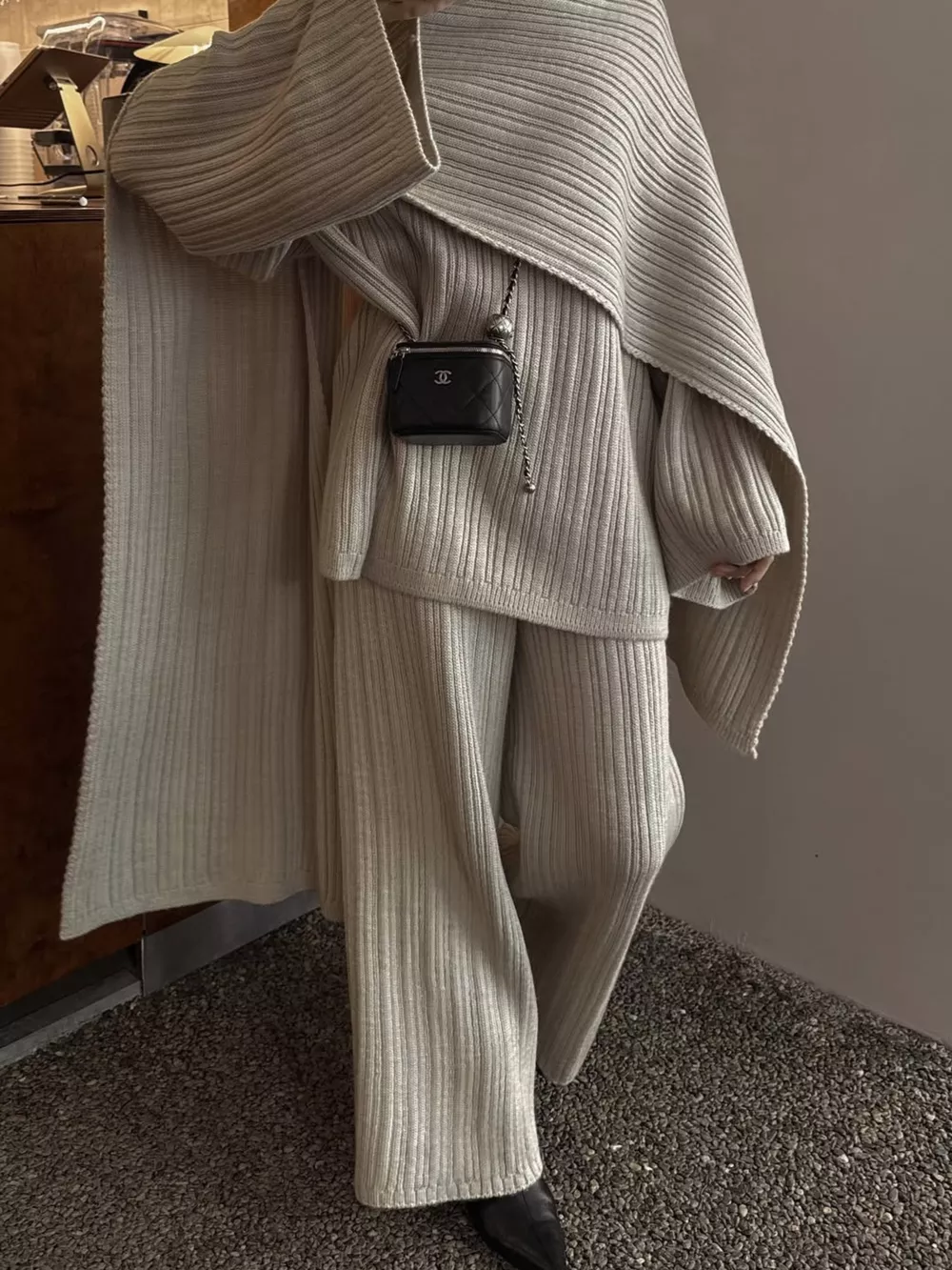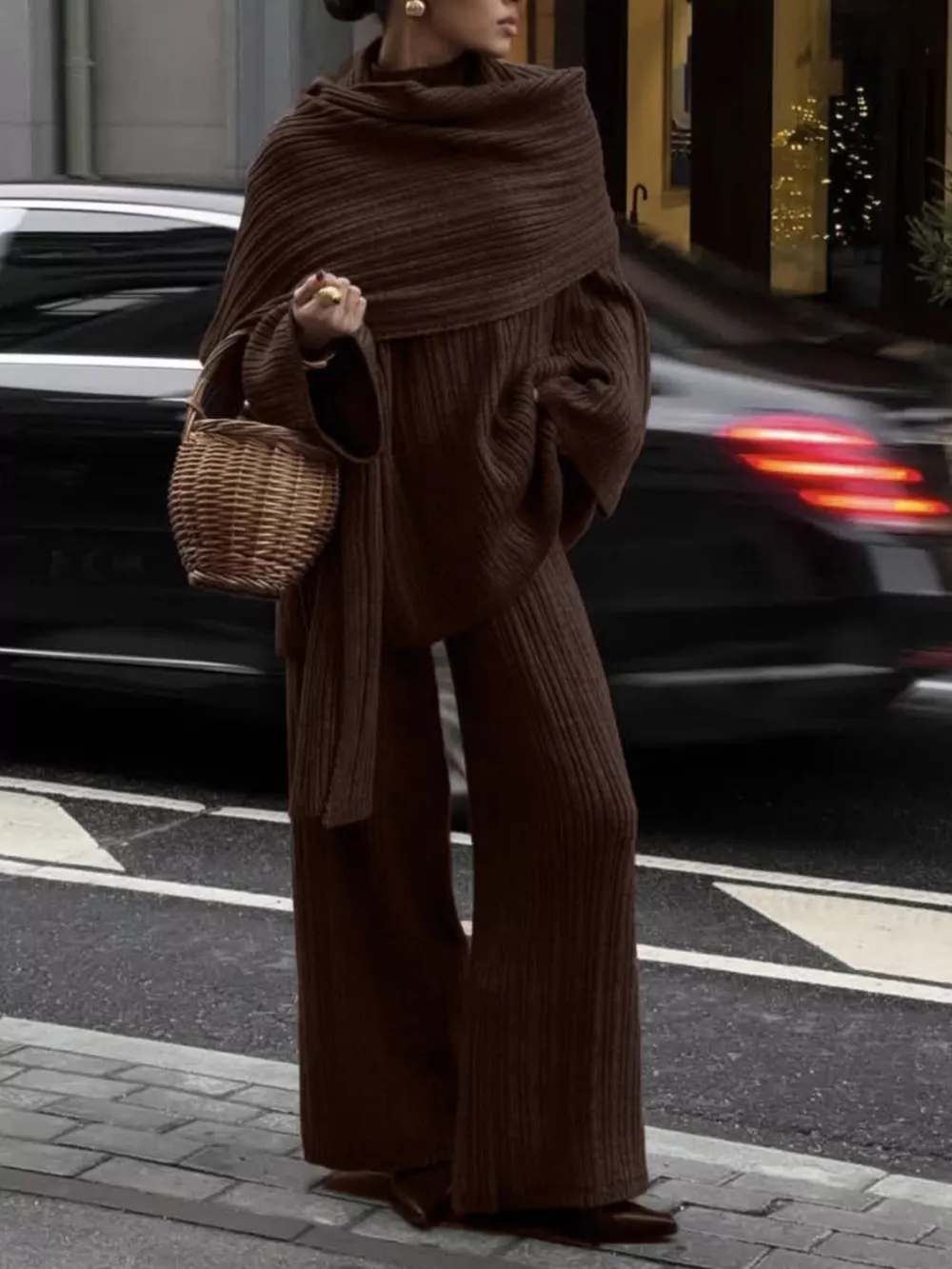 3-Piece Crew Neck Ribbed Sweater and Wide-Leg Pants Set with Scarf