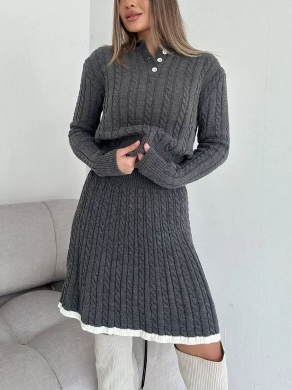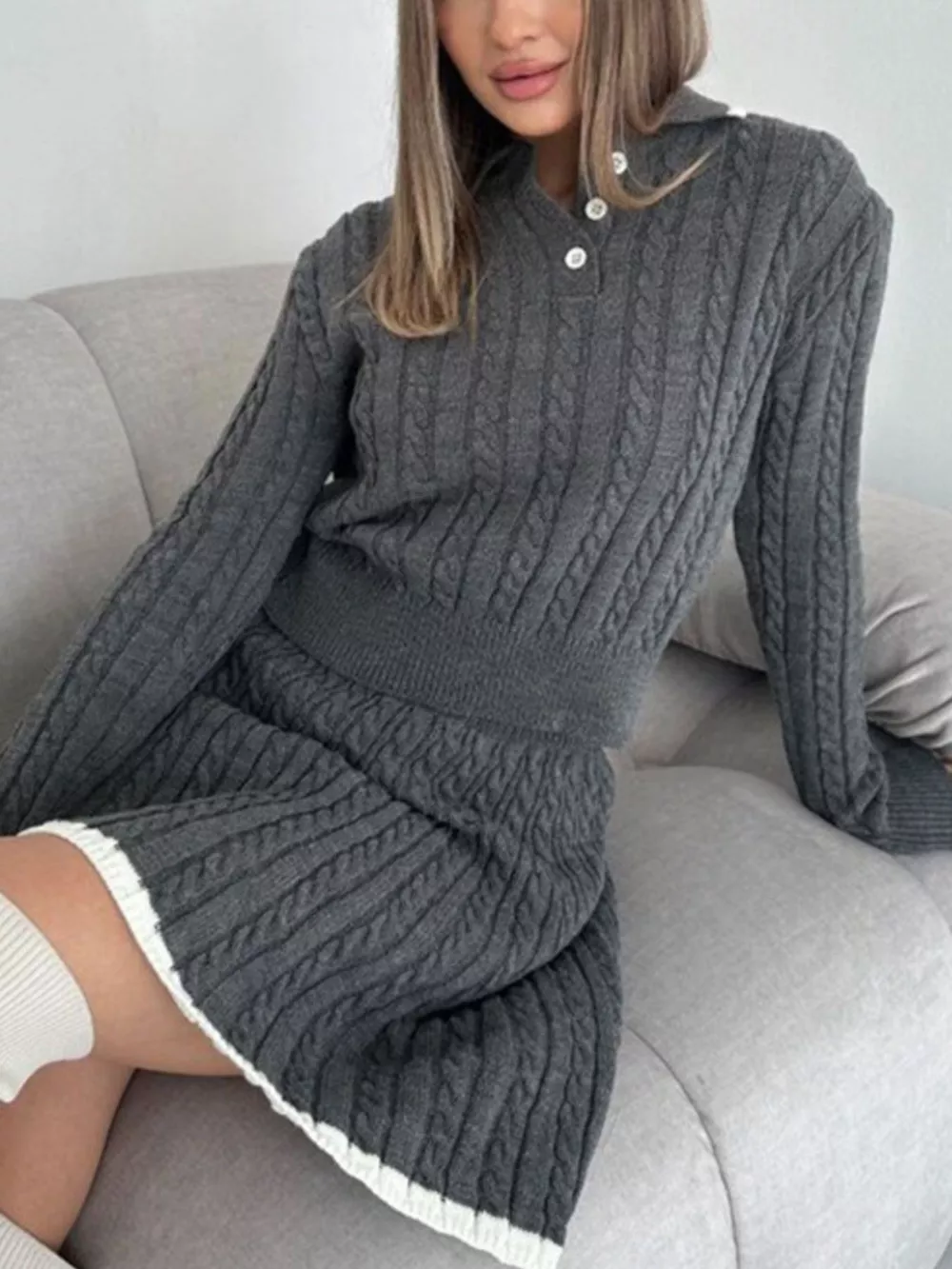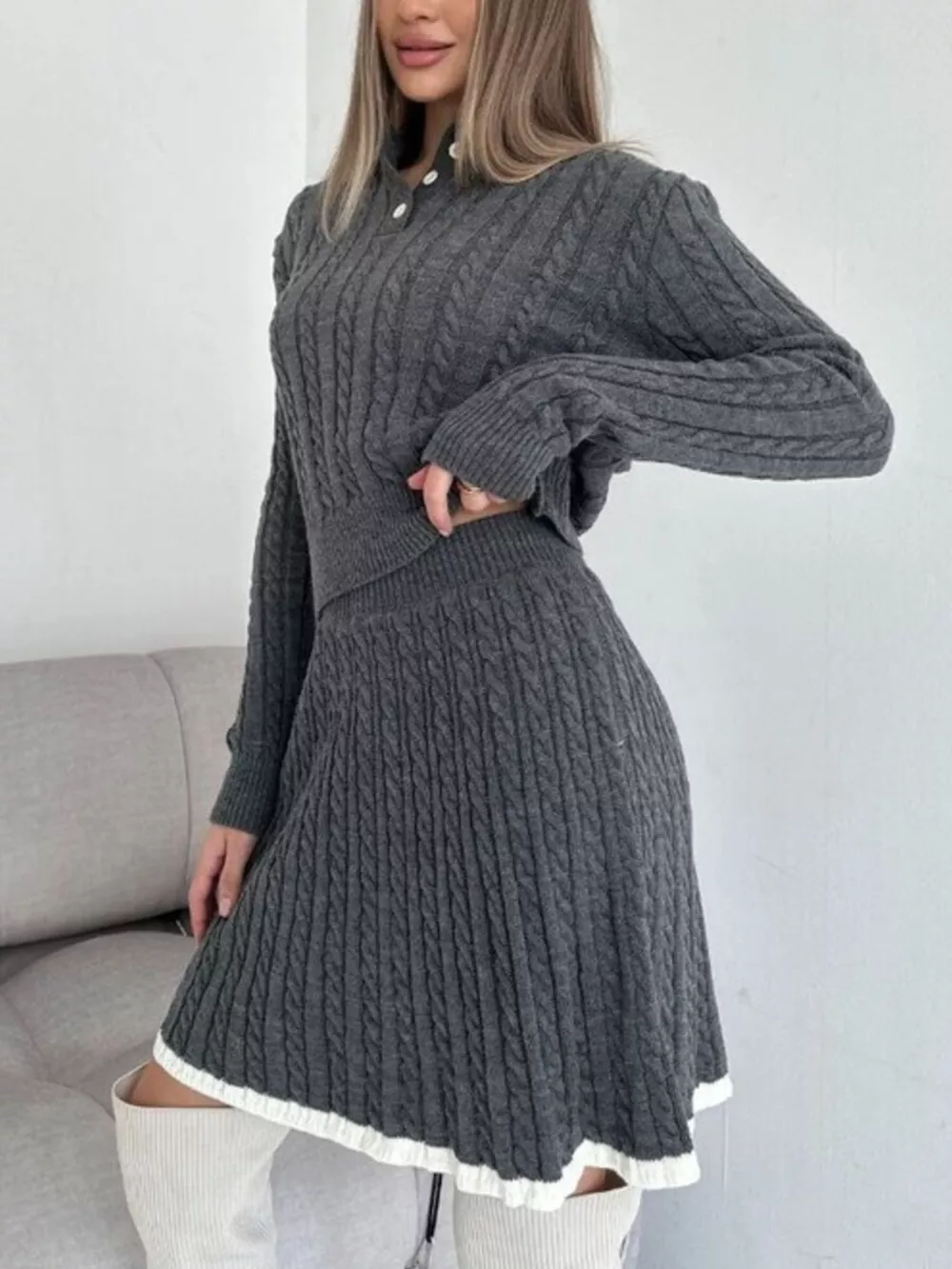 Cable Knit Long Sleeve Top and Skirt Sweater Set