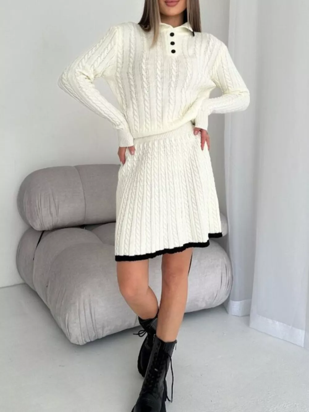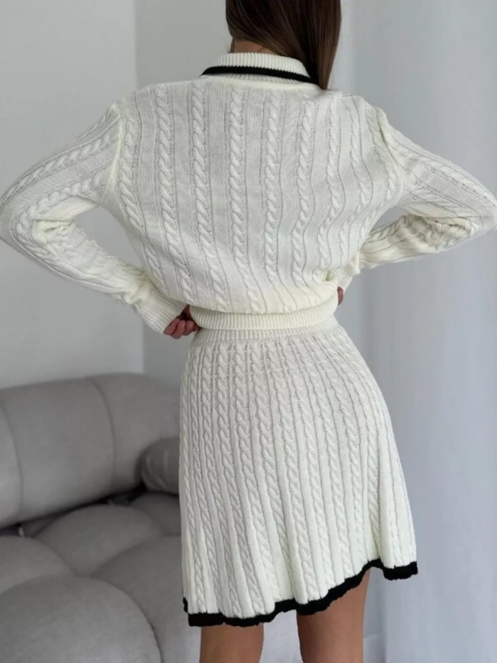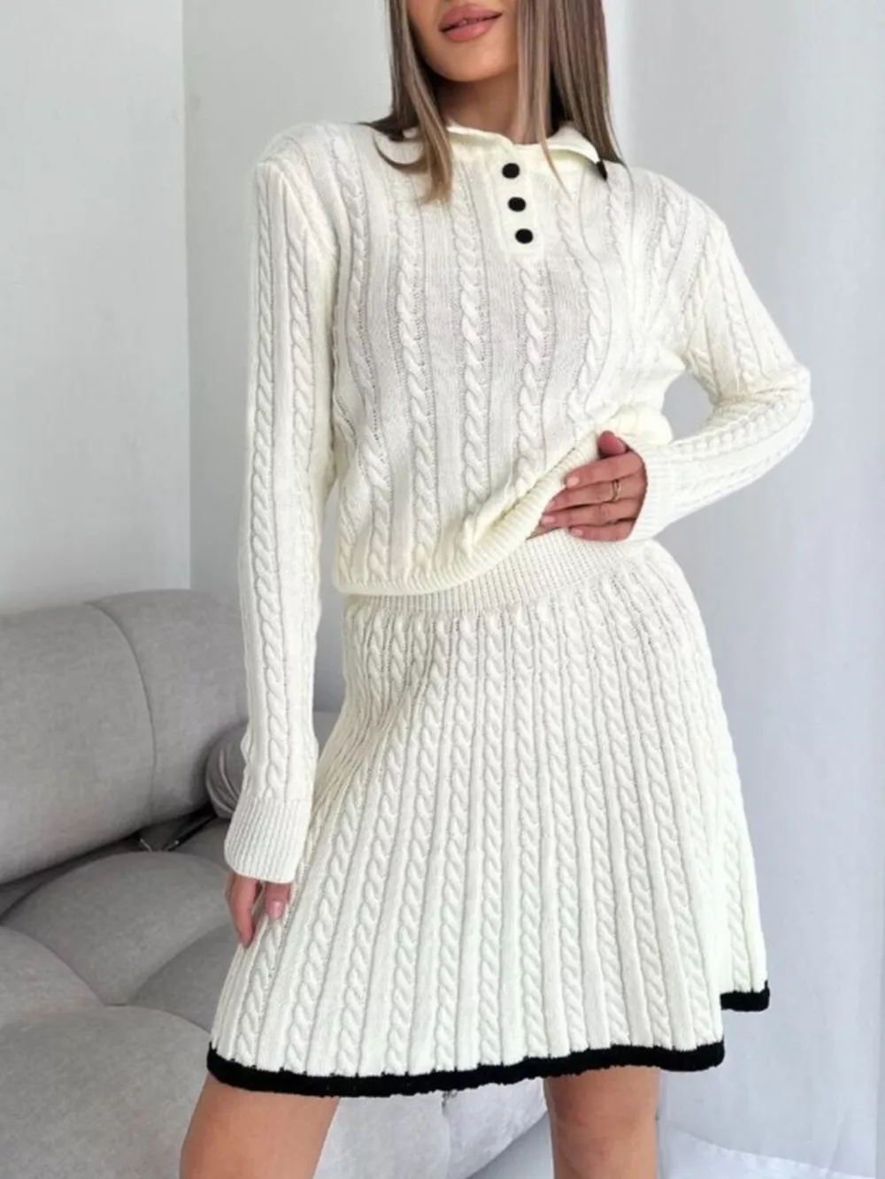 Cable Knit Long Sleeve Top and Skirt Sweater Set