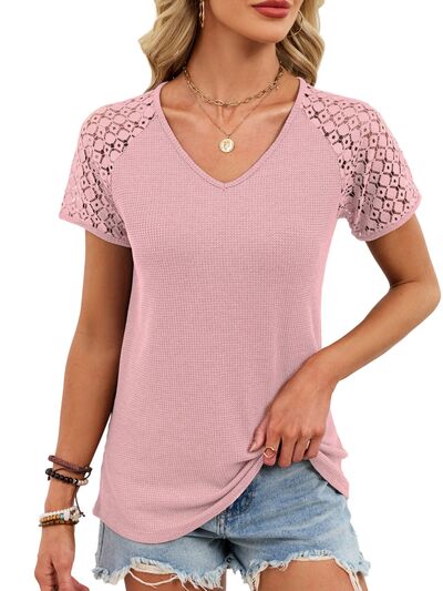 Lace Sleeve V-Neck Waffle Knit T-Shirt