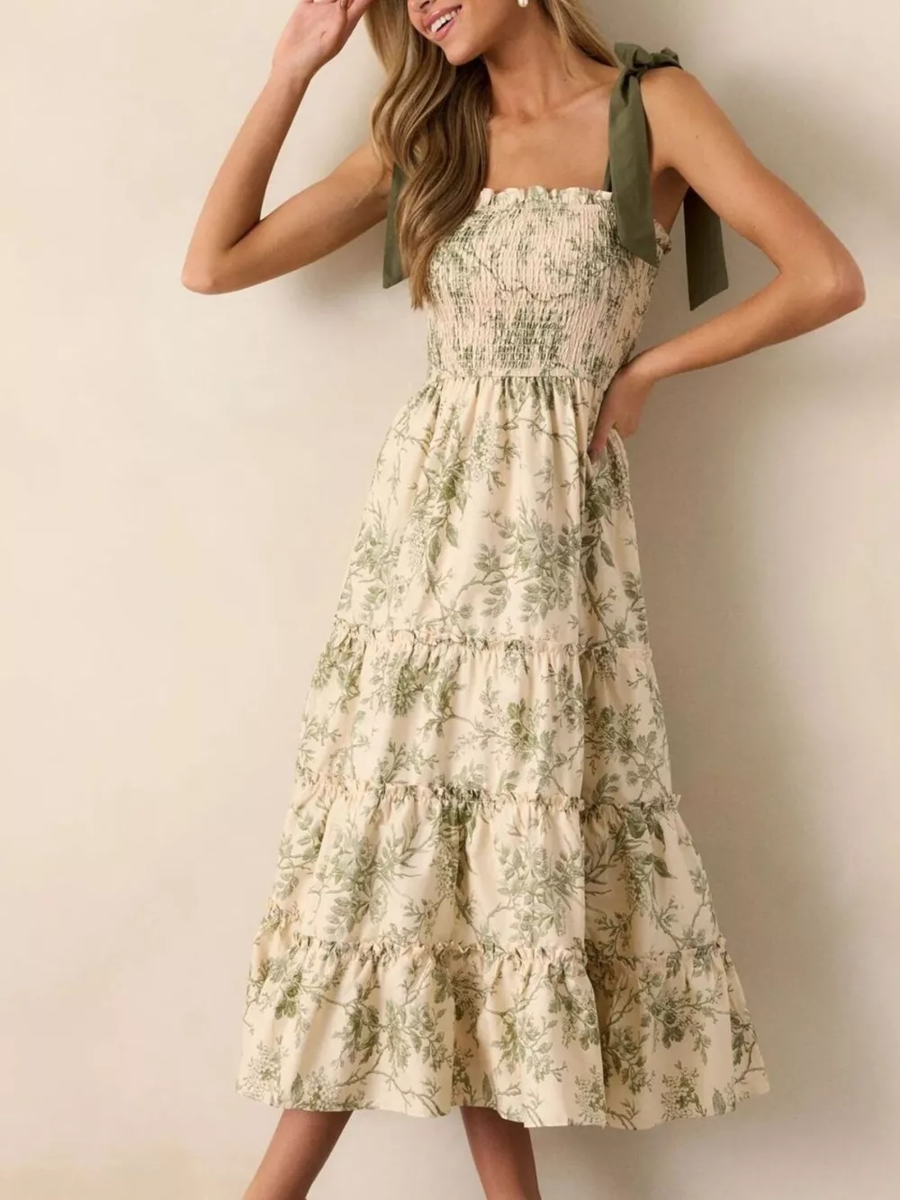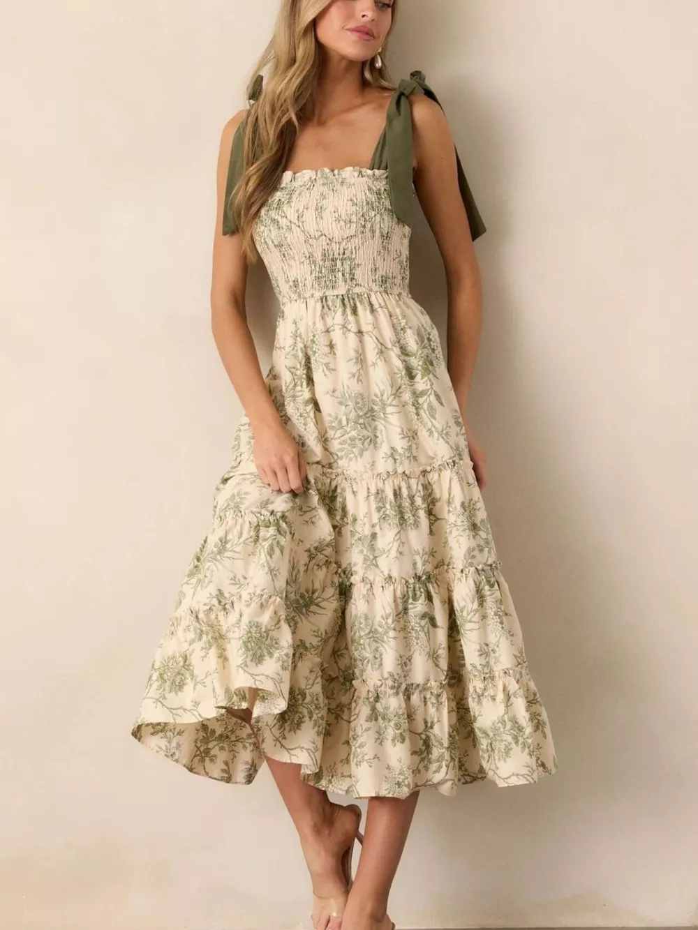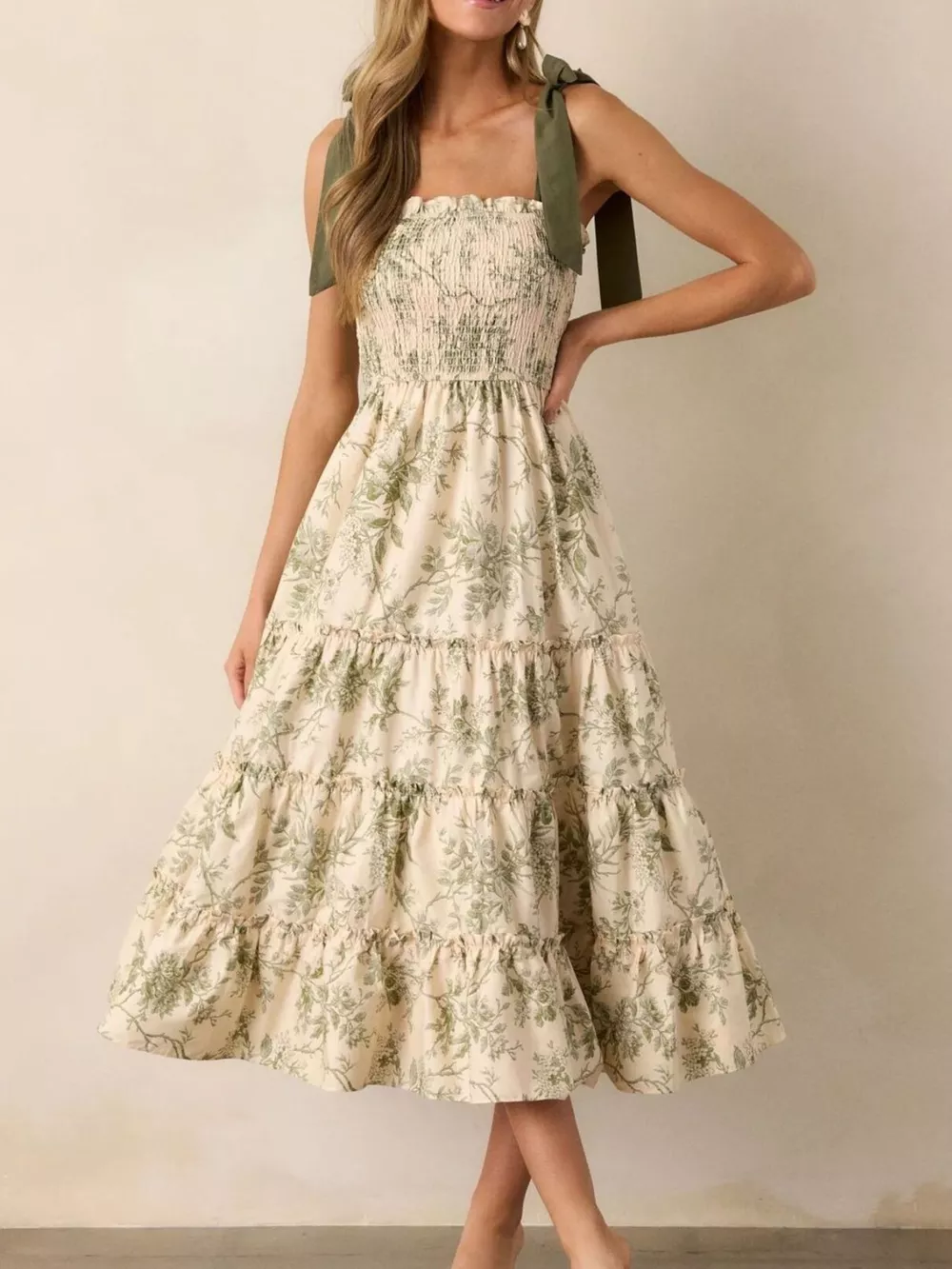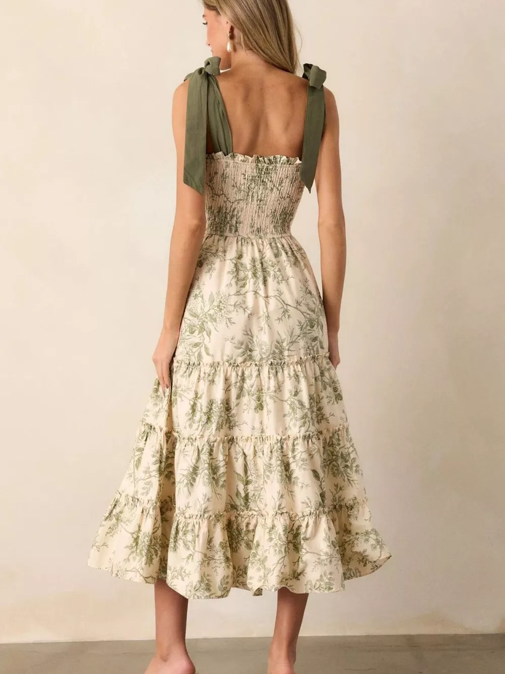 Floral Print Tiered Midi Dress with Tie Straps