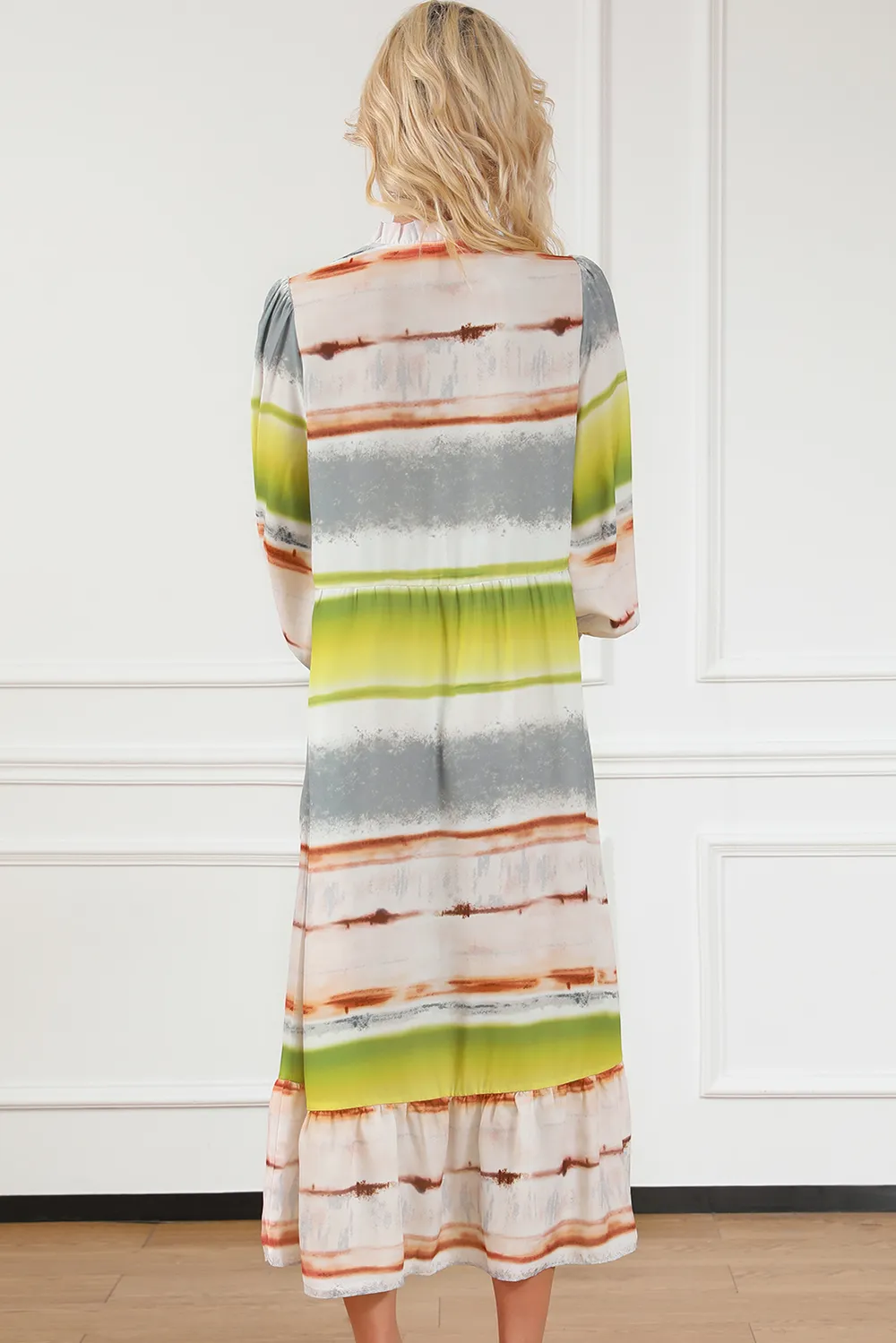 Detailed description of the Striped Half Button Smocked Long Sleeve Ruffle Hem Dress, highlighting quality, design, and unique features that make it appealing to end consumers.