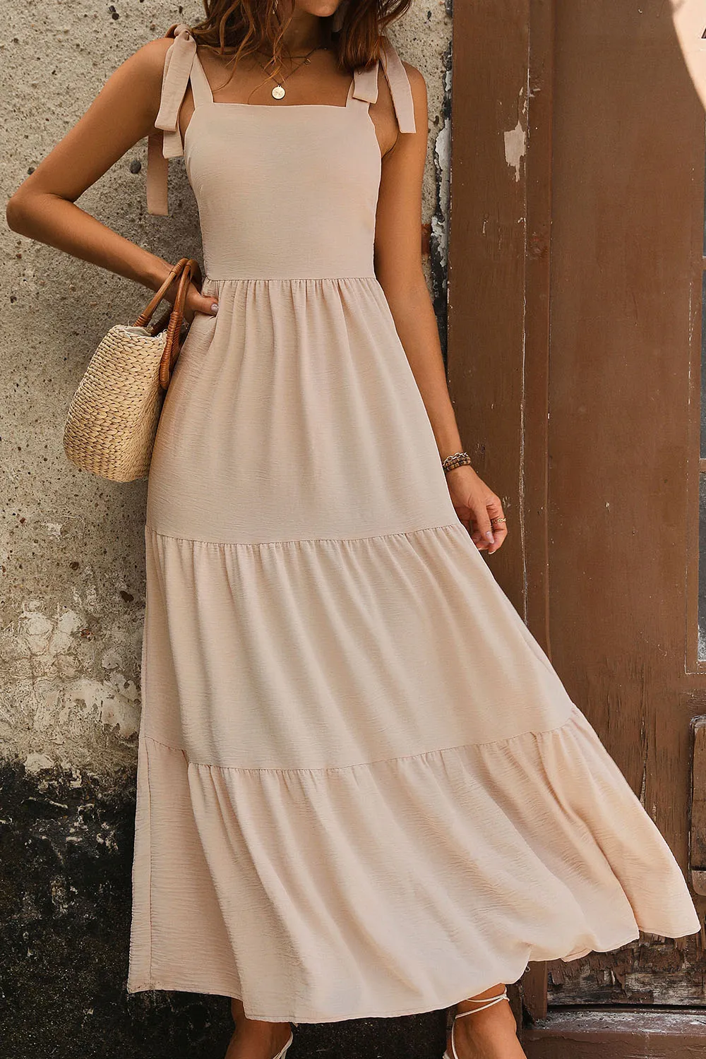 Detailed description of the Perfee Tie Shoulder Smocked Tiered Dress, highlighting quality, design, and unique features that make it appealing to end consumers.